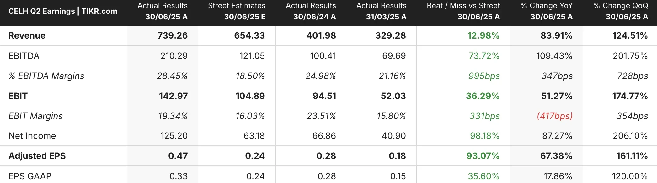 Sus ingresos ascendieron a 739 millones de dólares, superando las expectativas de los analistas, que esperaban 654 millones, lo que supone un 13% más. El crecimiento interanual de los ingresos, del 84%, se debió principalmente a la adquisición el 1 de abril de la marca Alani Nu, de rápido crecimiento, que aportó 301 millones de dólares en ingresos trimestrales y obtuvo lo que la empresa calificó de resultados “extraordinarios”.