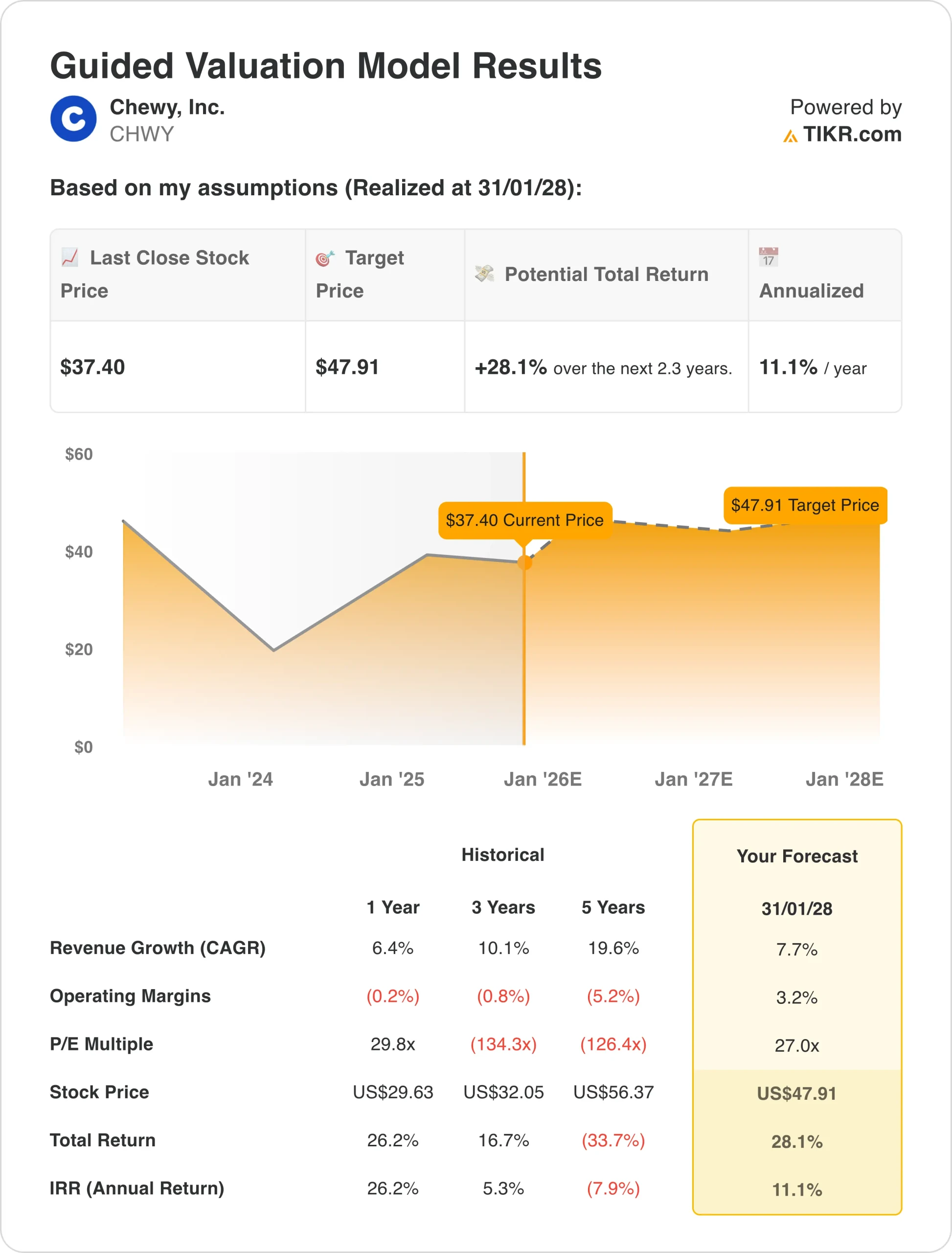 - El precio de las acciones de Chewy podría alcanzar los 48 dólares por acción en enero de 2028, según nuestras hipótesis de valoración.