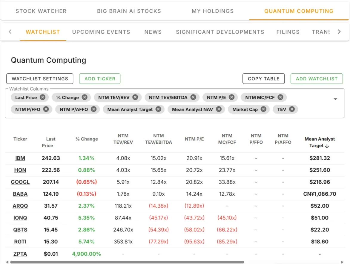 - Cree una lista de vigilancia: Póngale el nombre de “Quantum Computing” para hacer un seguimiento conjunto del grupo. Así podrá comparar el rendimiento y las valoraciones de un vistazo.