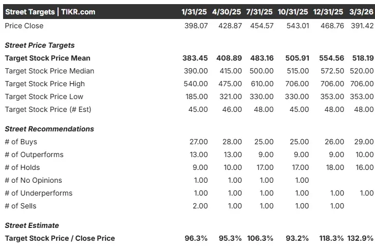 El precio objetivo de consenso de Street de 518,19 dólares representa una atractiva rentabilidad potencial del 32,4% desde los 391,42 dólares actuales.