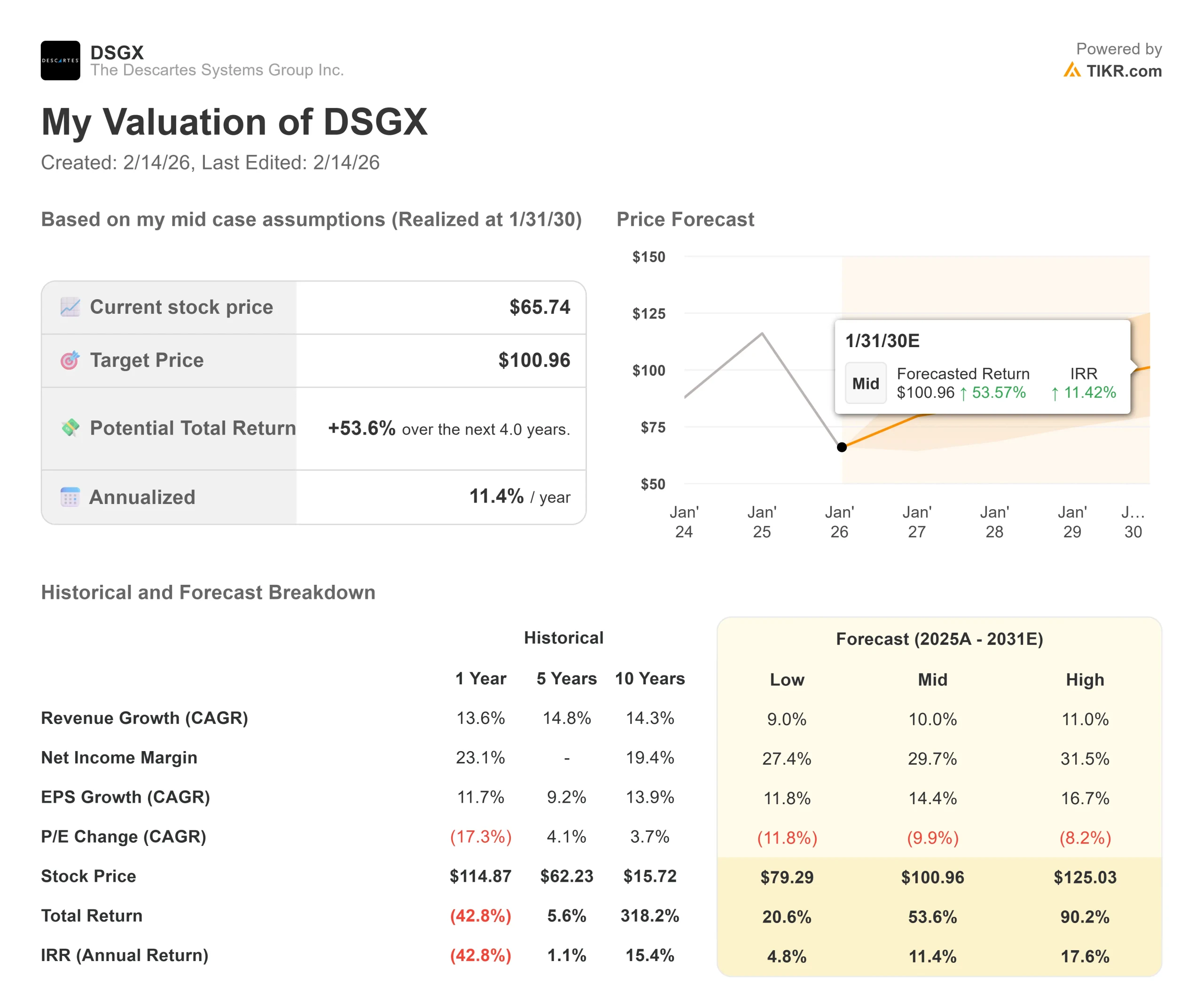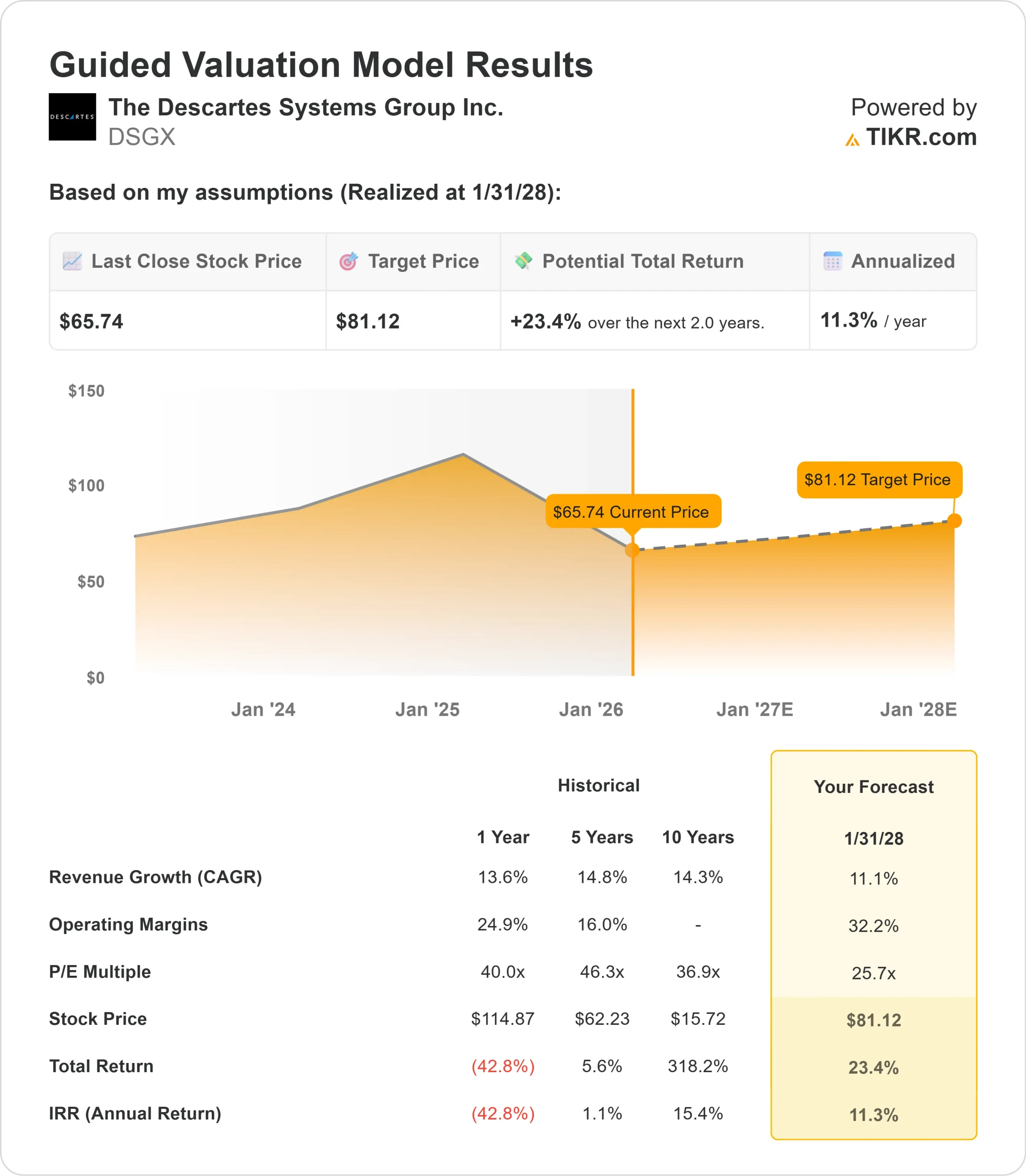 - Caso alto: Si la aceleración de la demanda impulsada por la IA impulsa un crecimiento de los ingresos del 11% mientras Descartes mantiene unos márgenes del 32%, la rentabilidad total podría alcanzar el 90% (18% anual).