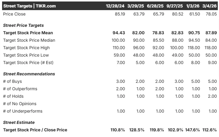 - Precio objetivo de la calle: 87,89 dólares