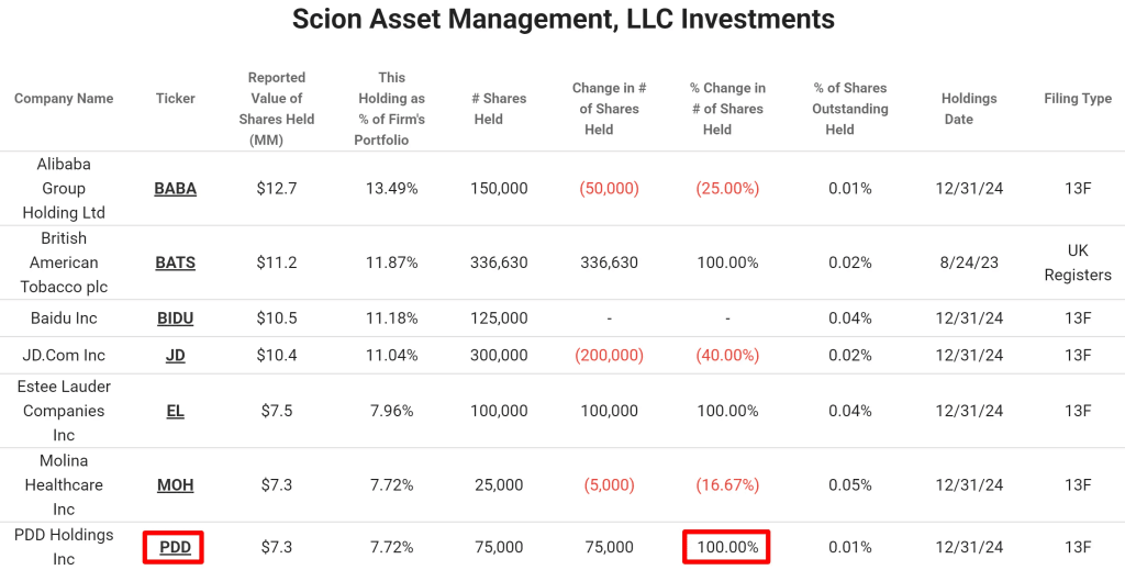 El trimestre pasado, Michael Burry (Scion Asset Management) inició una posición en Pinduoduo y David Tepper (Appaloosa Management) la amplió.