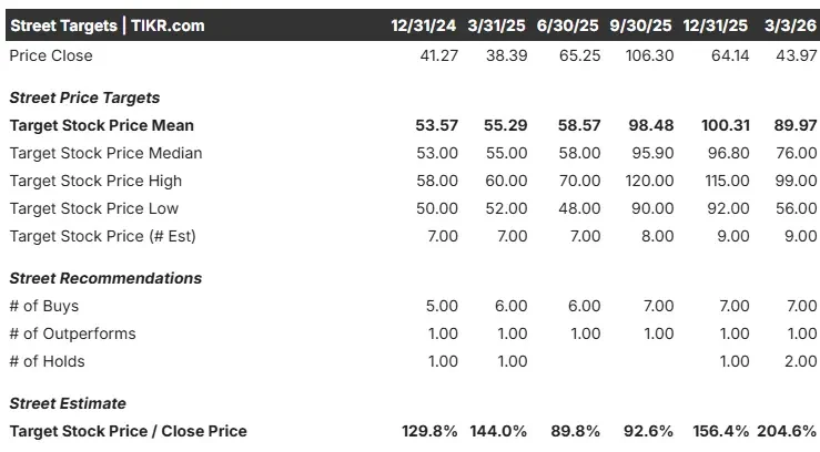El precio objetivo de consenso de Street de 89,97 dólares representa una atractiva rentabilidad potencial del 104,6% desde la base actual de 43,97 dólares.
