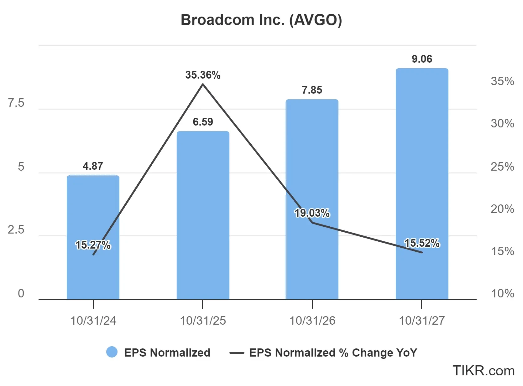 Las acciones de Broadcom podrían ofrecer una rentabilidad anualizada del 21% en los próximos dos años debido al fuerte crecimiento previsto de los beneficios de la empresa y a su bajo múltiplo de valoración.