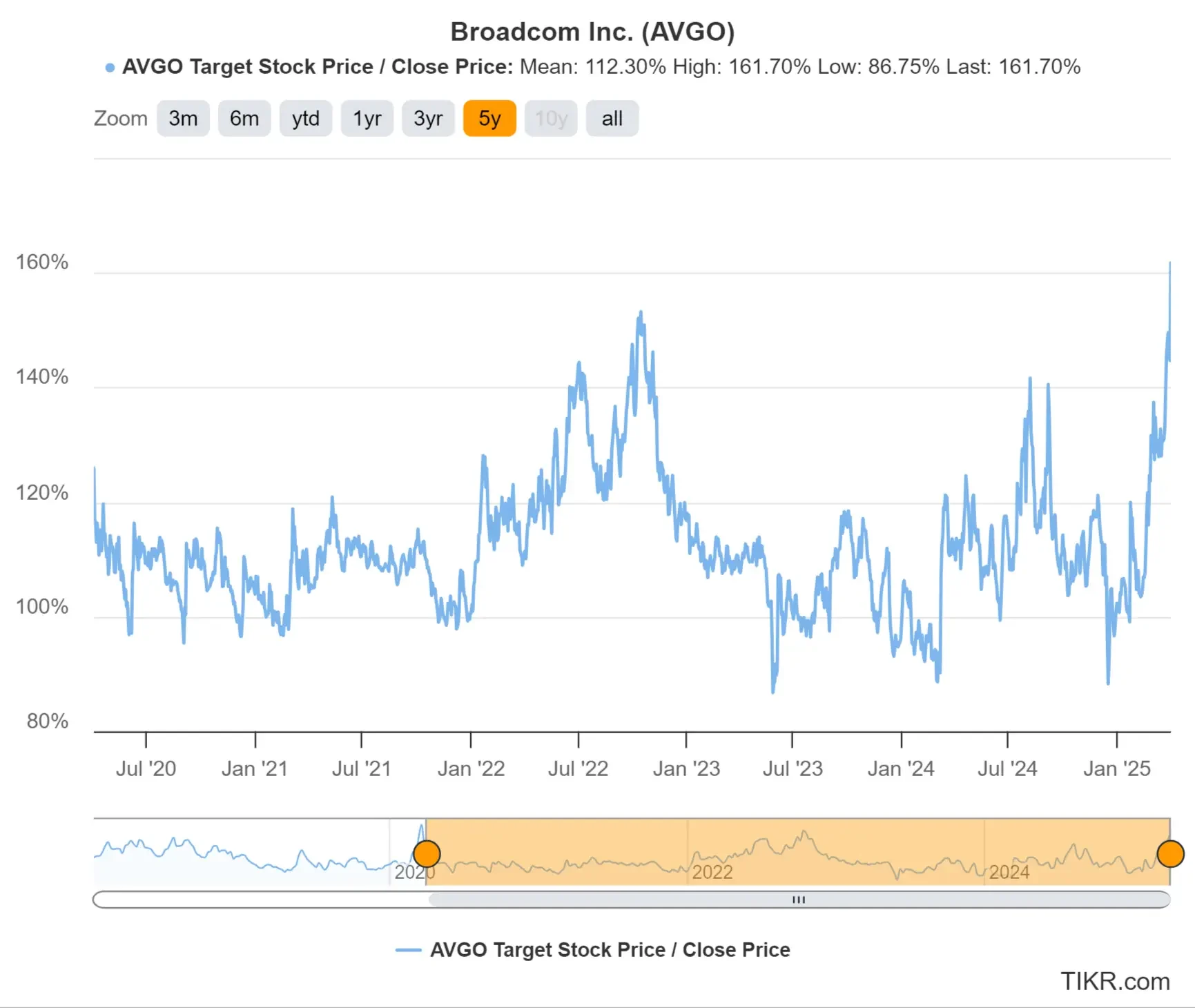 Los analistas tienen un precio objetivo medio de unos 249 $/acción para las acciones de Broadcom en la actualidad, lo que significa que ven más de un 60% de subida para las acciones en la actualidad.