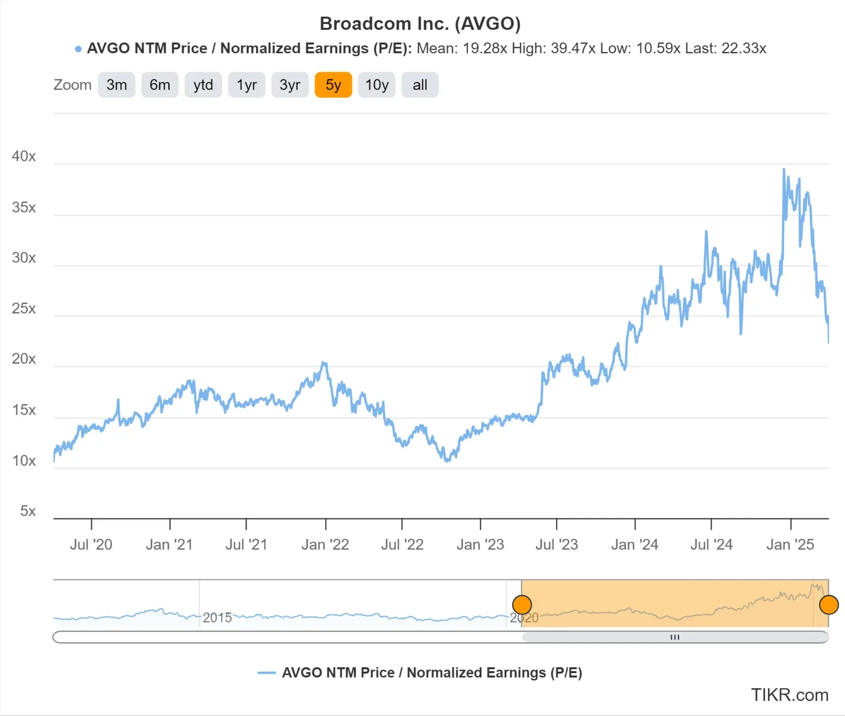 En los últimos 5 años, Broadcom ha cotizado a un PER medio de 19,3 veces, como muestra el gráfico de PER histórico.