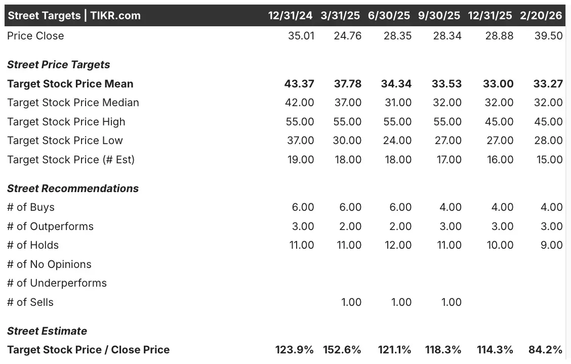 Sin embargo, las acciones de RNG cotizan ahora por encima del objetivo medio de los analistas de 33,27 dólares, basado en las últimas 15 estimaciones. Entre los 16 analistas que cubren la acción, 4 la califican de Comprar, 3 de Superar y 9 de Mantener. El objetivo medio se sitúa en 32 $, mientras que el objetivo máximo es de 45 $ y el mínimo de 28 $.