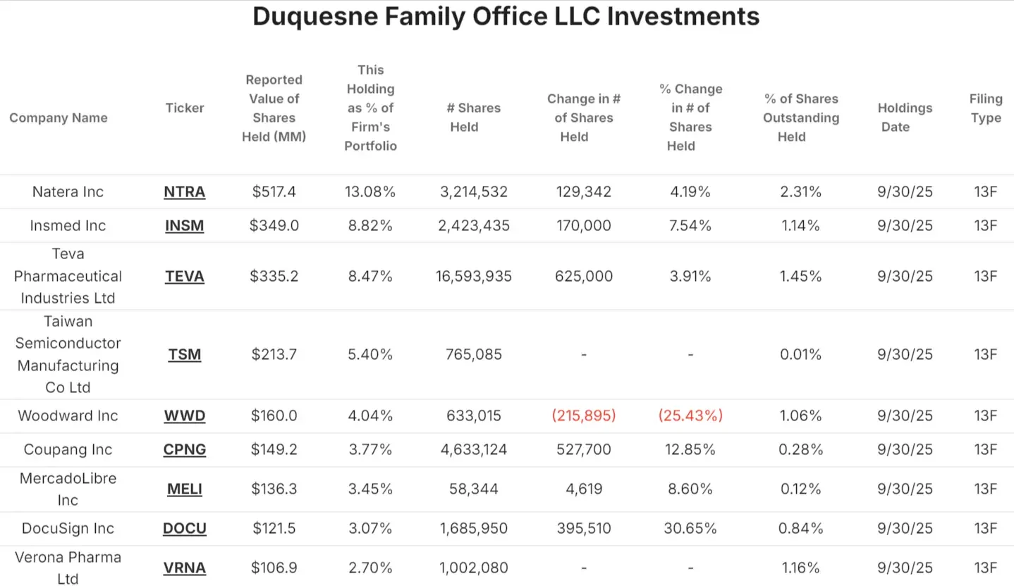 Parmi les principales positions de Druckenmiller figurent Natera, Insmed, Teva, TSMC et Woodward. Au dernier trimestre, la société a renforcé des positions telles que Natera, Insmed, Teva, Coupang, MercadoLibre et DocuSign, tout en réduisant fortement ses positions sur Woodward.