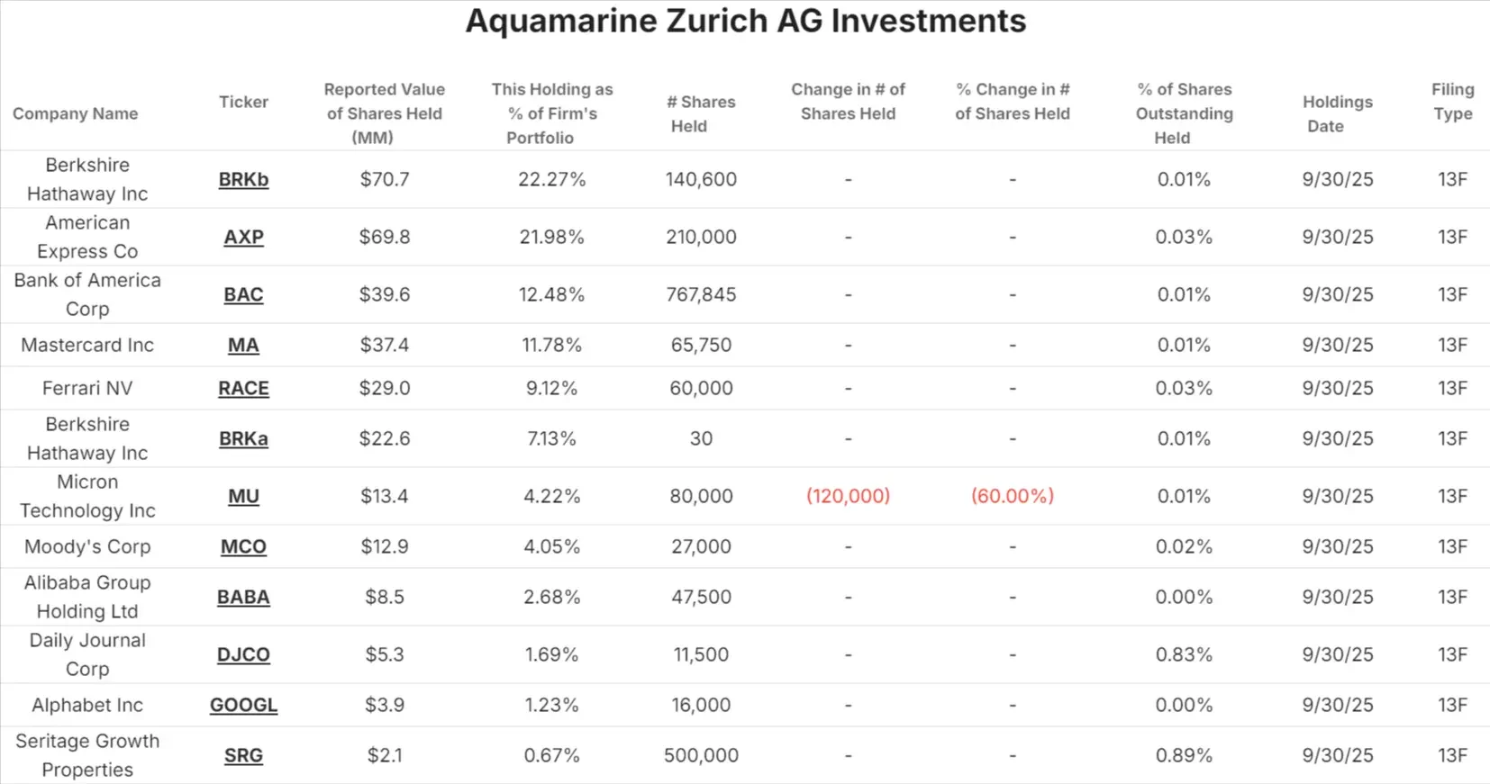 Aquamarine gère un portefeuille à long terme ultra-concentré, de style très Buffett, axé sur des sociétés composées de haute qualité. Le portefeuille est dominé par Berkshire Hathaway, American Express, Bank of America et Mastercard, qui représentent ensemble la grande majorité des actifs.