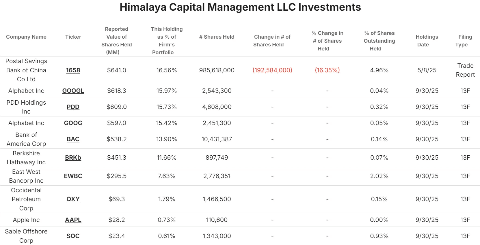Au dernier trimestre, le mouvement le plus important a été une réduction considérable de Postal Savings Bank of China, alors que les positions principales comme Alphabet, PDD et Bank of America n'ont pas été touchées. Himalaya est particulièrement intéressant à suivre pour des idées à long terme et à forte conviction sur les actions américaines et chinoises.