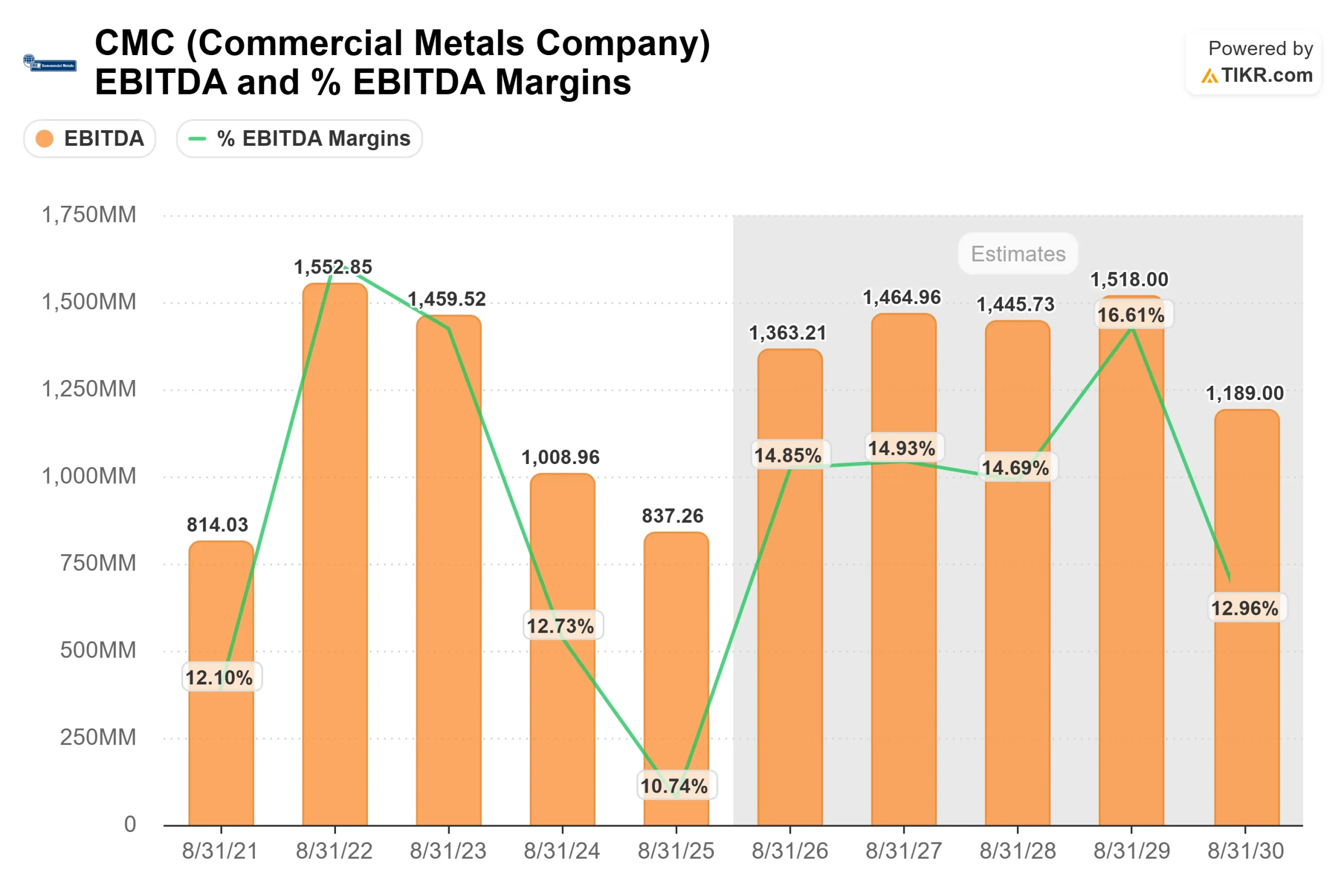 L'hypothèse moyenne de TIKR suppose un TCAC des revenus de 2,5 % jusqu'à l'exercice 2030, grâce à la construction de centres de données et d'infrastructures énergétiques dans les principaux marchés américains de CMC et à la mise en service de l'usine d'acier de Virginie-Occidentale. Le moteur de la marge est le programme TAG, dont la direction estime qu'il dépassera 150 millions de dollars en bénéfices d'EBITDA annualisés d'ici la fin de l'exercice. L'hypothèse moyenne de marge bénéficiaire nette est de 8,0 %, avec une compression annuelle de 2,9 % du ratio cours/bénéfice, reflétant l'arrivée à maturité d'un cycle de revalorisation.