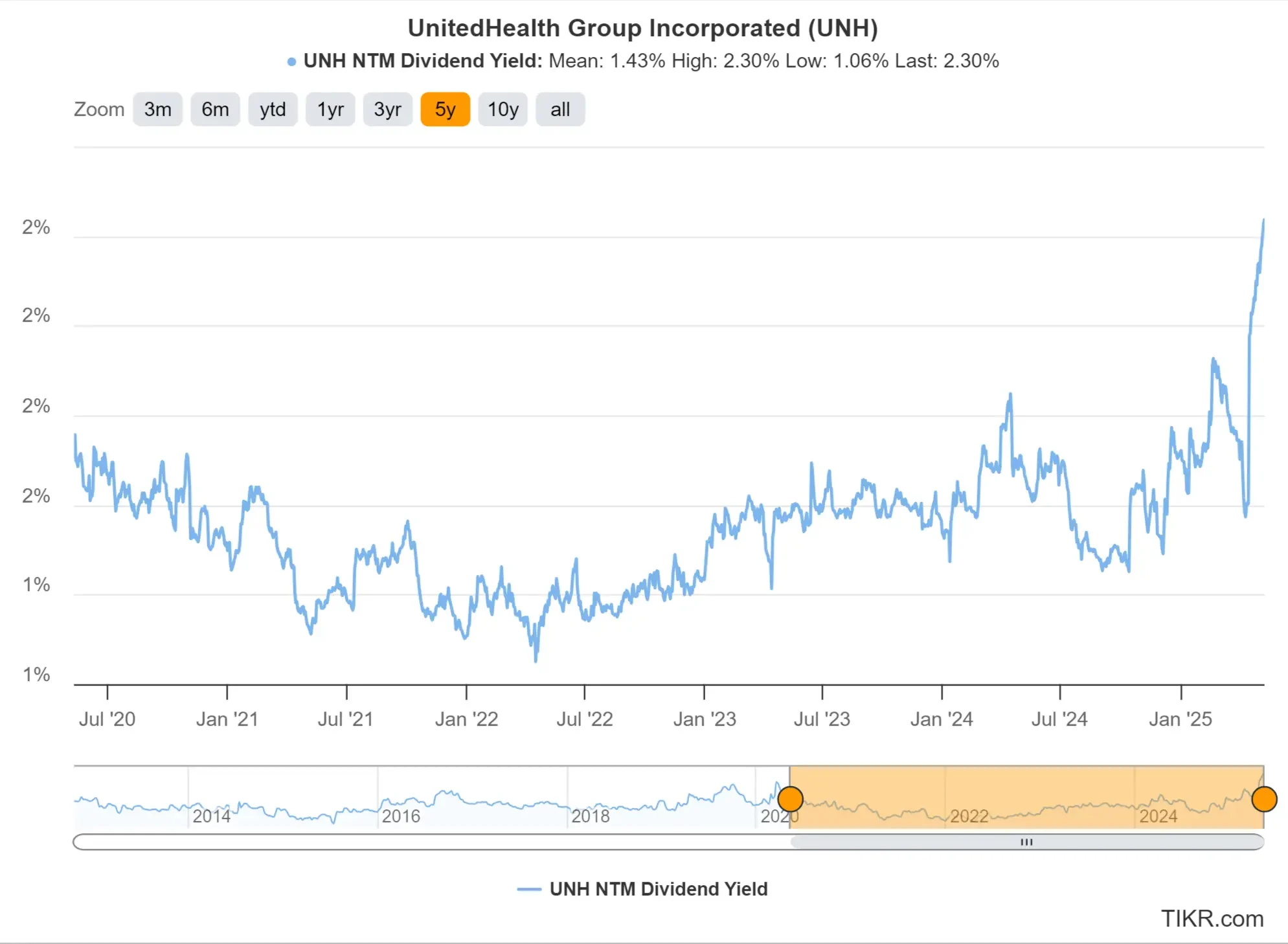 Le rendement prévisionnel du dividende de UNH est actuellement d’environ 2,3 %, ce qui est le taux le plus élevé des 5 dernières années.