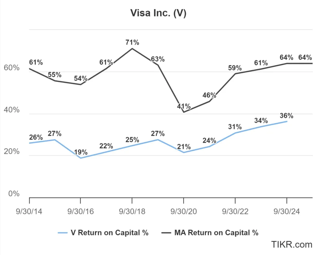 - Visa (V) et Mastercard (MA) gèrent des entreprises à faible actif avec un levier d’exploitation élevé, ce qui leur permet de générer un RCI bien supérieur à 20 % avec des besoins en capitaux minimes.