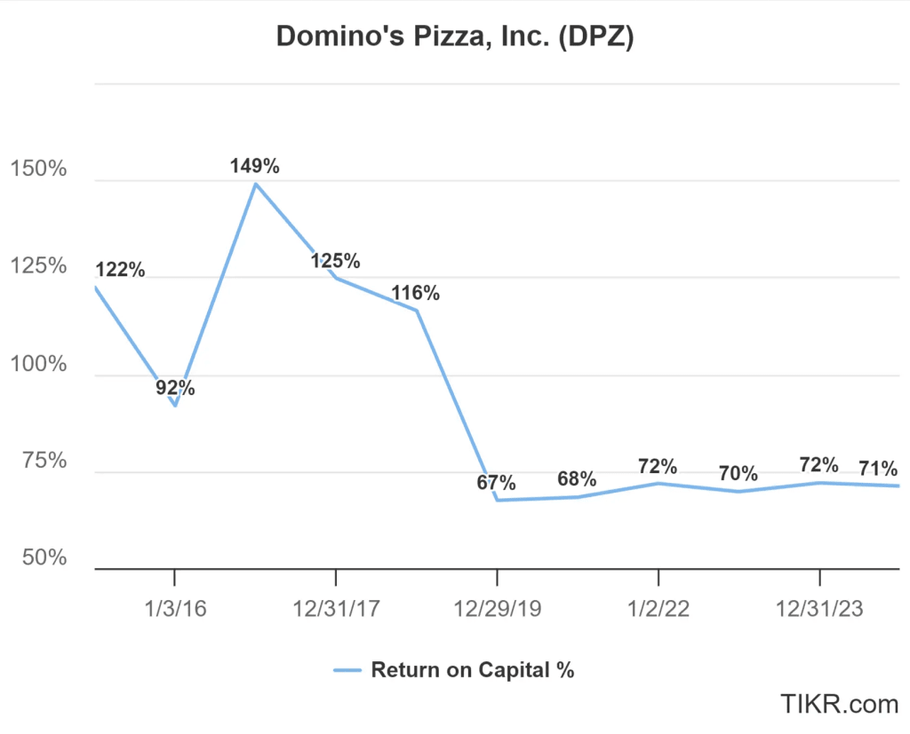 - Domino’s Pizza (DPZ) a construit un modèle de franchise efficace qui nécessite peu de capital tout en générant des bénéfices importants. Son RCI dépasse actuellement 70 %, ce qui montre à quel point l’entreprise a réussi à augmenter ses bénéfices sans réinvestir massivement.