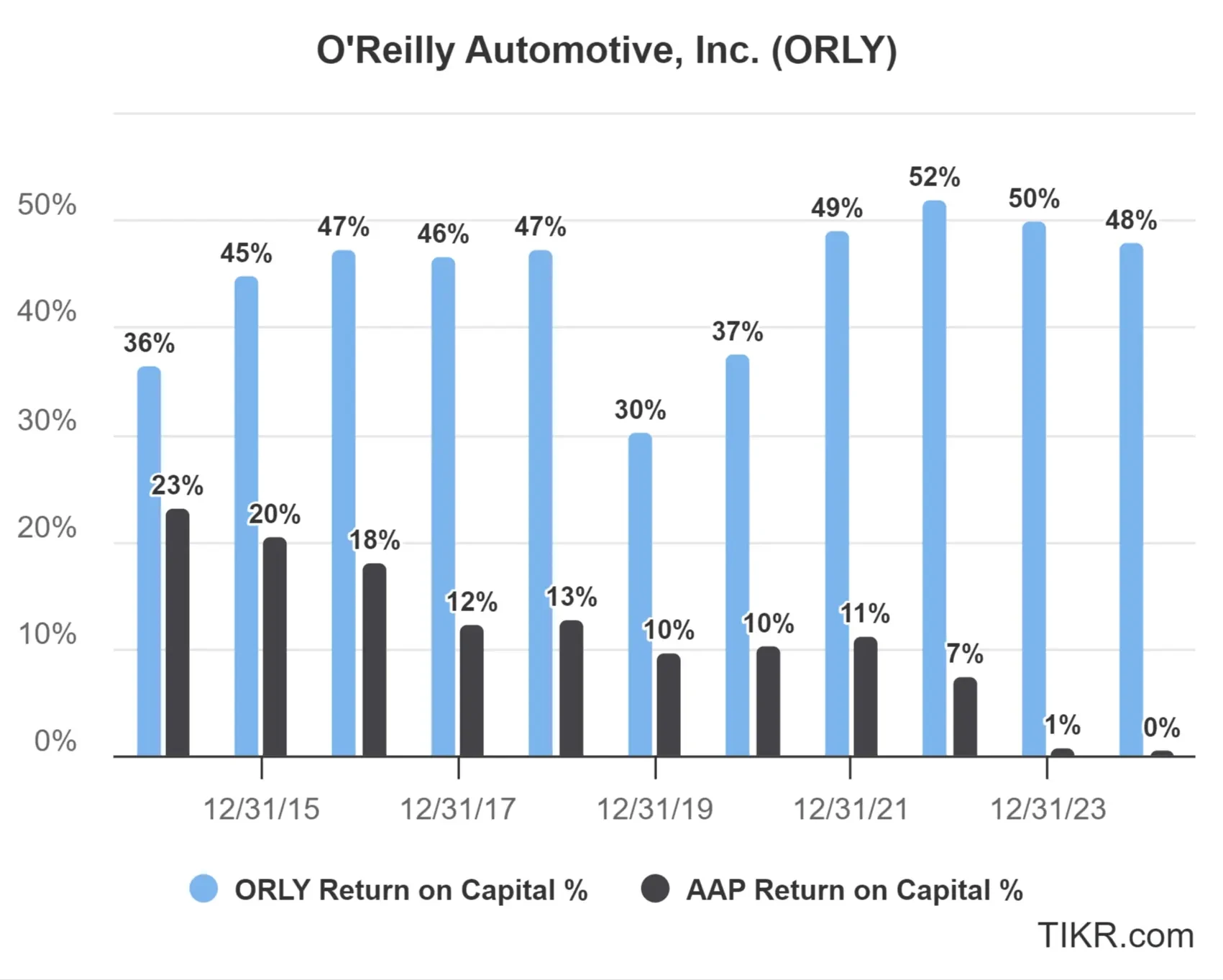 Il est important de comprendre les raisons de la différence de ROIC, mais toutes choses étant égales par ailleurs, cela montre qu’O’Reilly est l’entreprise la plus efficace.