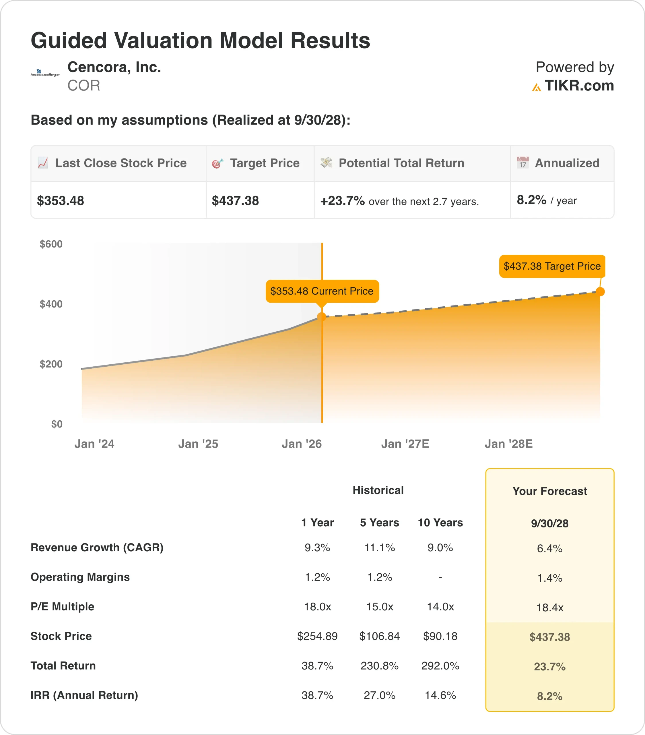 Valuta i tuoi titoli preferiti come Cencora con 5 anni di previsioni degli analisti utilizzando il nuovo modello di valutazione di TIKR (è gratuito) >>>.