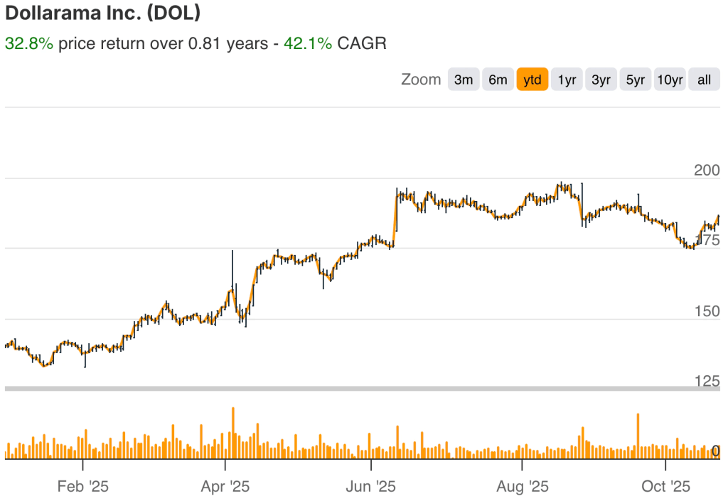 Anche in un contesto macro difficile, Dollarama ha costantemente registrato una crescita degli utili a due cifre, sostenuta da una gestione disciplinata delle scorte e da solide relazioni con i fornitori. Il controllo dei costi offre all'azienda la flessibilità necessaria per assorbire l'inflazione senza trasferirla interamente ai consumatori, un vantaggio competitivo che rafforza la fedeltà al marchio.