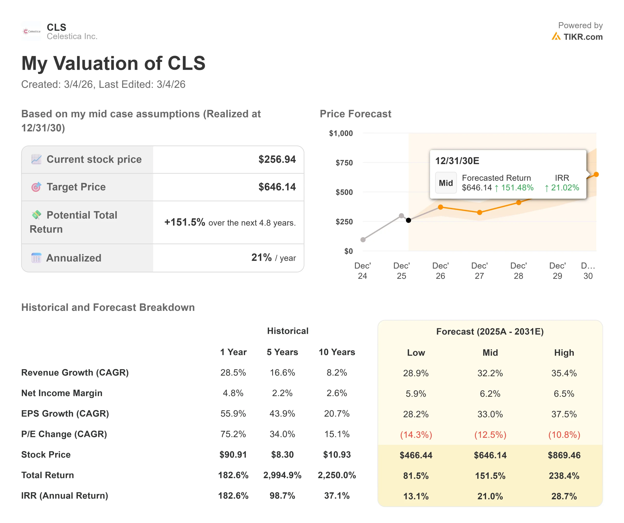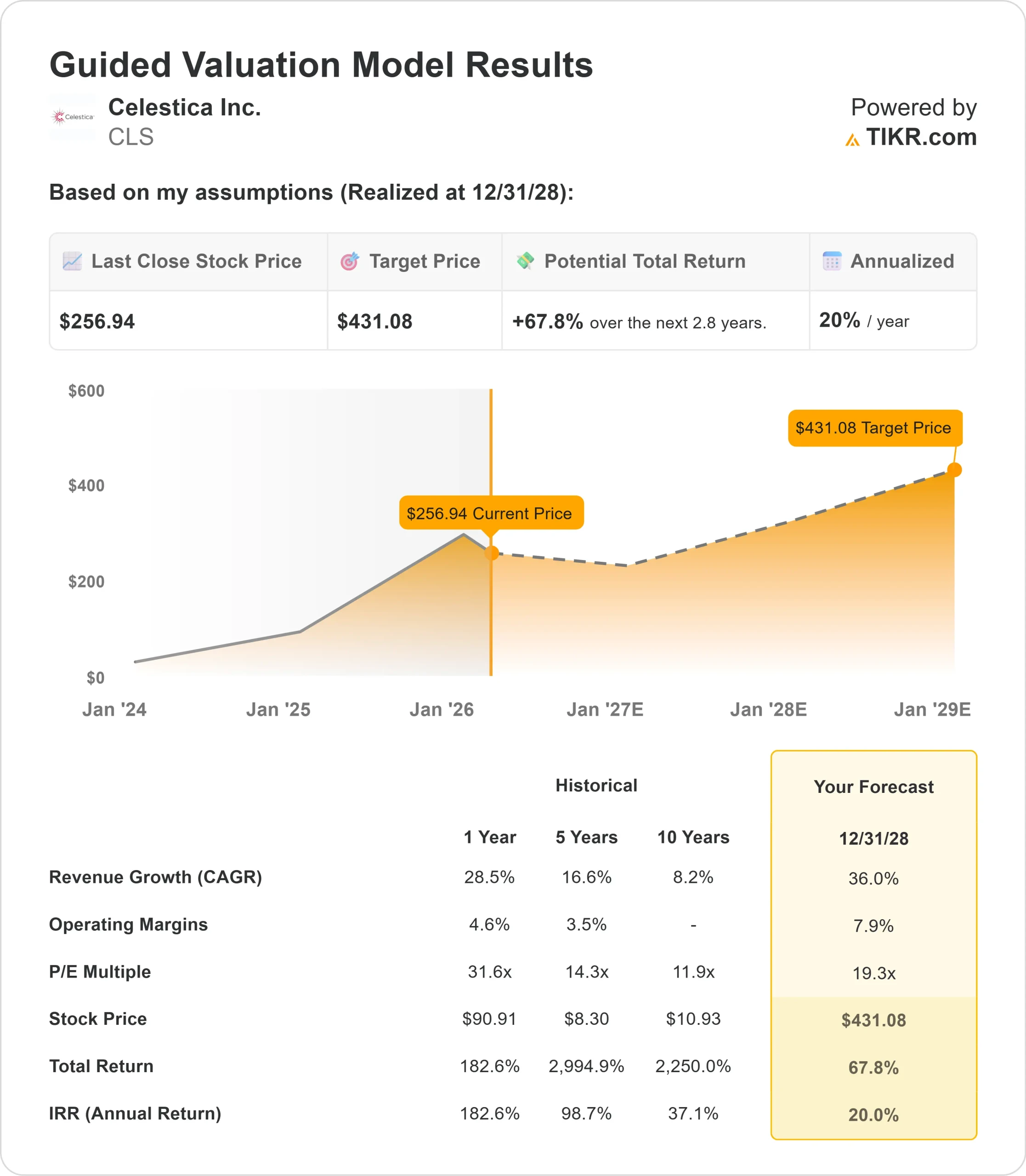 Da qui, TIKR calcola il prezzo potenziale dell'azione e i rendimenti totali negli scenari Toro, Base e Orso, in modo da poter vedere rapidamente se un titolo appare sottovalutato o sopravvalutato.
