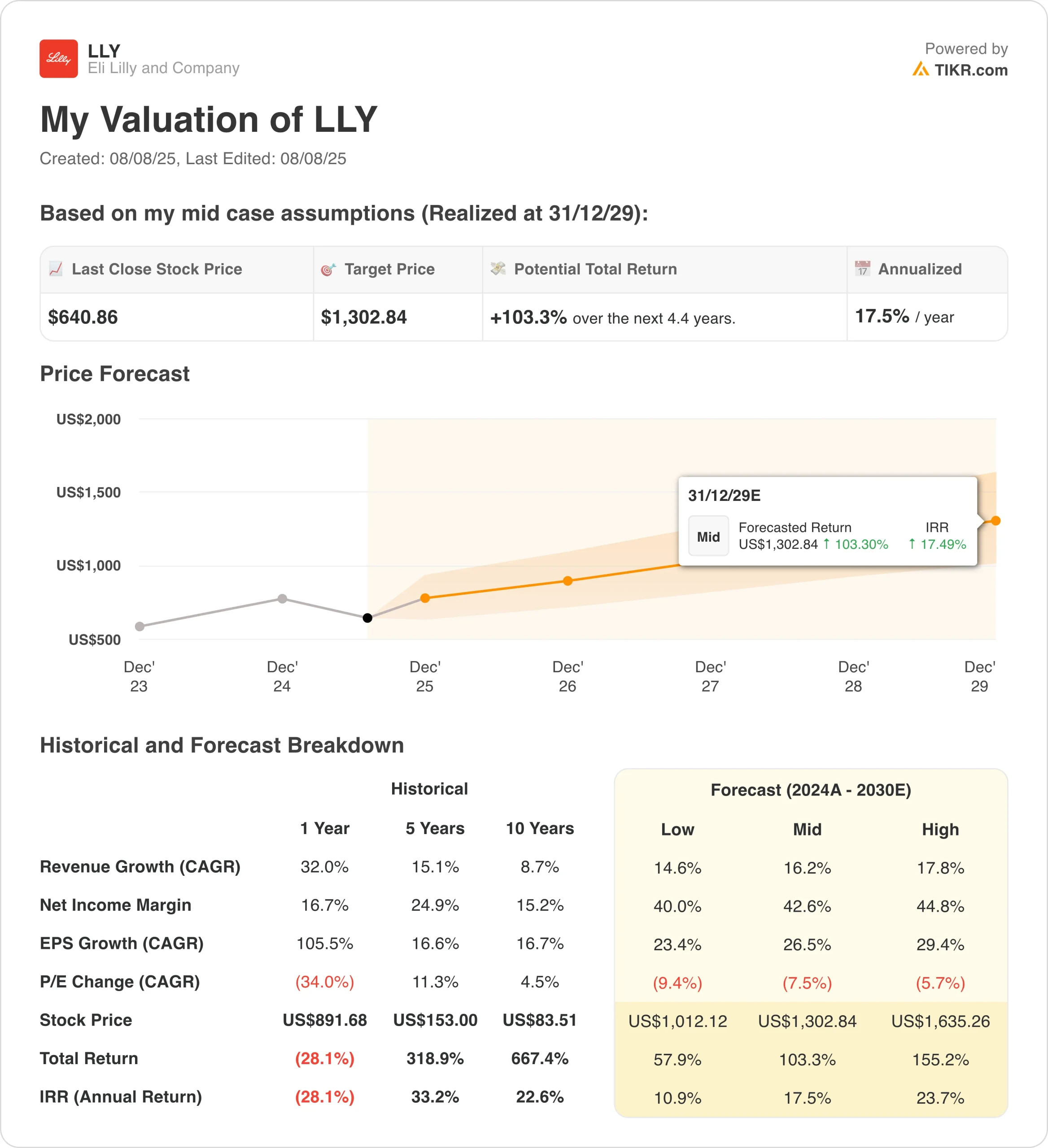 Sulla base delle stime di crescita dei ricavi annui del 23,3%, dei margini operativi del 45,5% e di un multiplo di valutazione P/E normalizzato, il modello prevede che il titolo LLY possa salire da 641 dollari/azione a 1.076 dollari/azione.