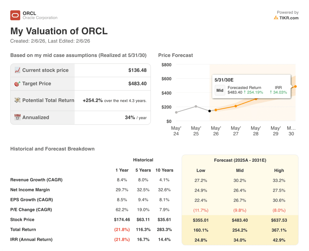- Matematica del rendimento: l'obiettivo di 296 dollari di Oracle implica un rialzo del 117% rispetto al prezzo attuale di 136 dollari, che si traduce in un rendimento annualizzato del 40% in circa 2 anni basato sulla crescita degli utili e su un multiplo costante di 19x.