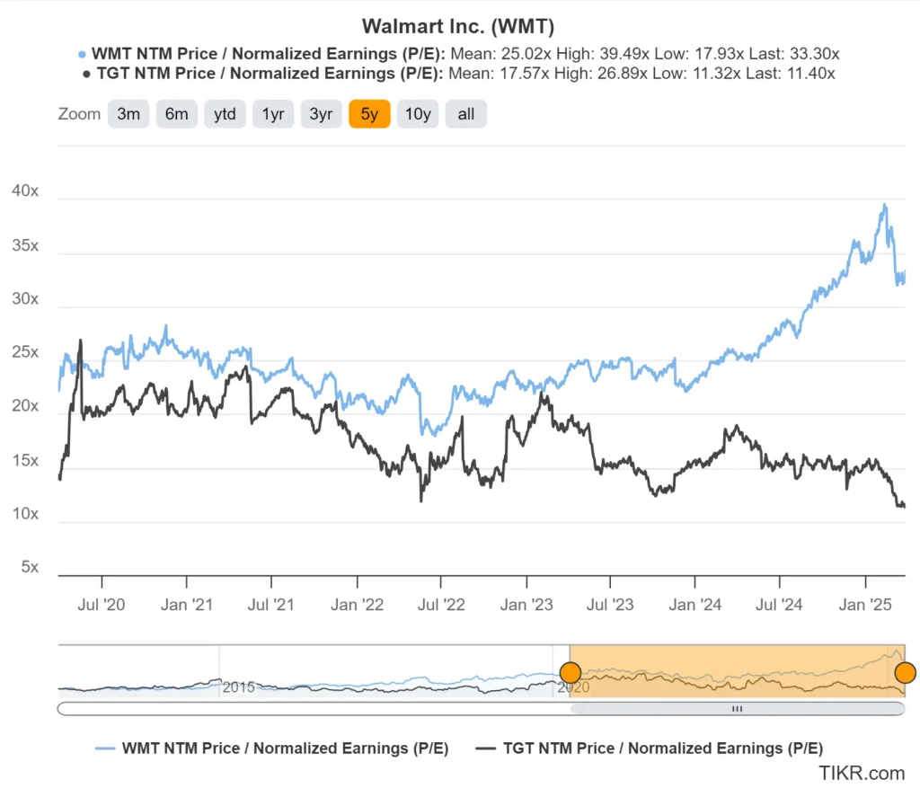 Figura 3: Rapporti P/E di Walmart e Target negli ultimi 10 e più anni