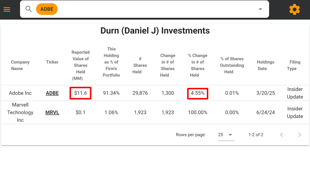 ダン・ダーンCFOは最近、アドビのポジションを約5%増やし、保有総額は約1160万ドルになった。