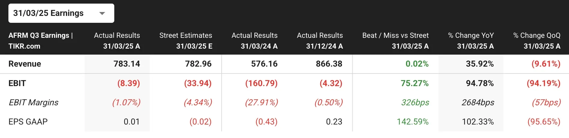 3月31日に終了した四半期、アファームは1株当たり0.01ドルの利益を計上し、アナリストのコンセンサス予想(0.02ドルの損失)を上回った。