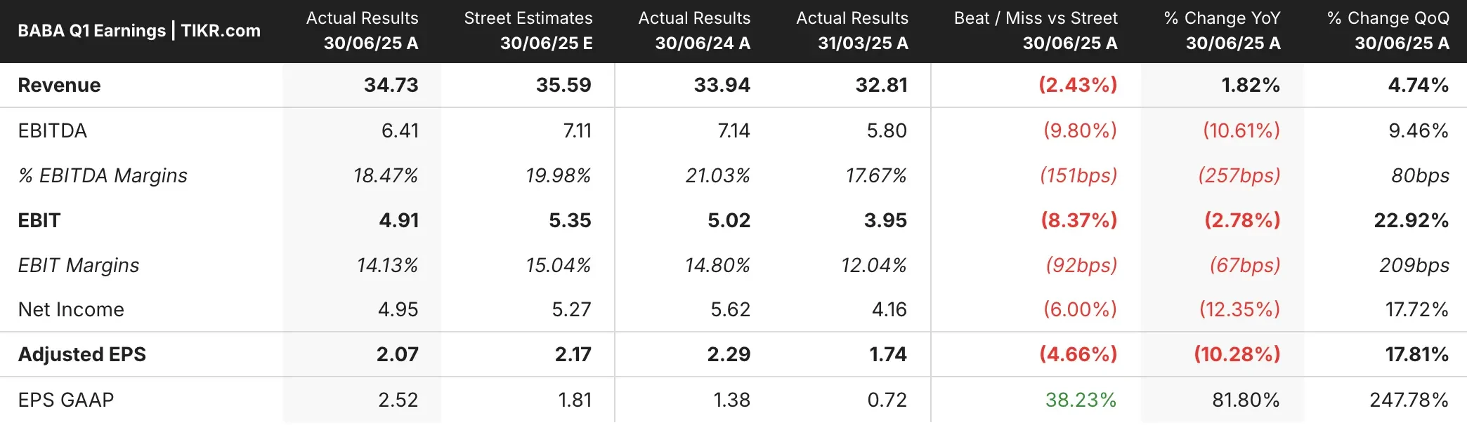 BABA株は、売上高がアナリスト予想を下回ったにもかかわらず、GAAPベースのEPSが前年比82%増となるなど、予想を上回る業績を発表し、金曜の終値は約13%高となった。