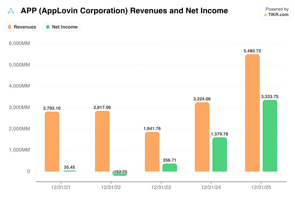 業績自体は並外れたものだ。AppLovinの2025年の売上高は前年比70%増の54億8000万ドル、純利益は33億3000万ドル、調整後EBITDAは45億1000万ドルに達した。また、2025年の営業キャッシュフローは39.7億ドル、フリーキャッシュフローは39.5億ドルとなった。