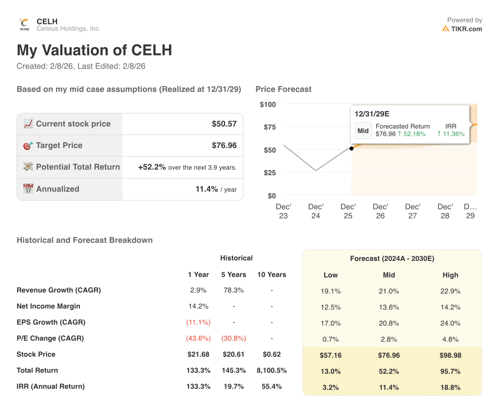 TIKRのシナリオを無料で再構築することで、カテゴリの成長は冷え込むがマージンは安定する場合に、セルシウス株のバリュエーションが維持されるかどうかを評価する。