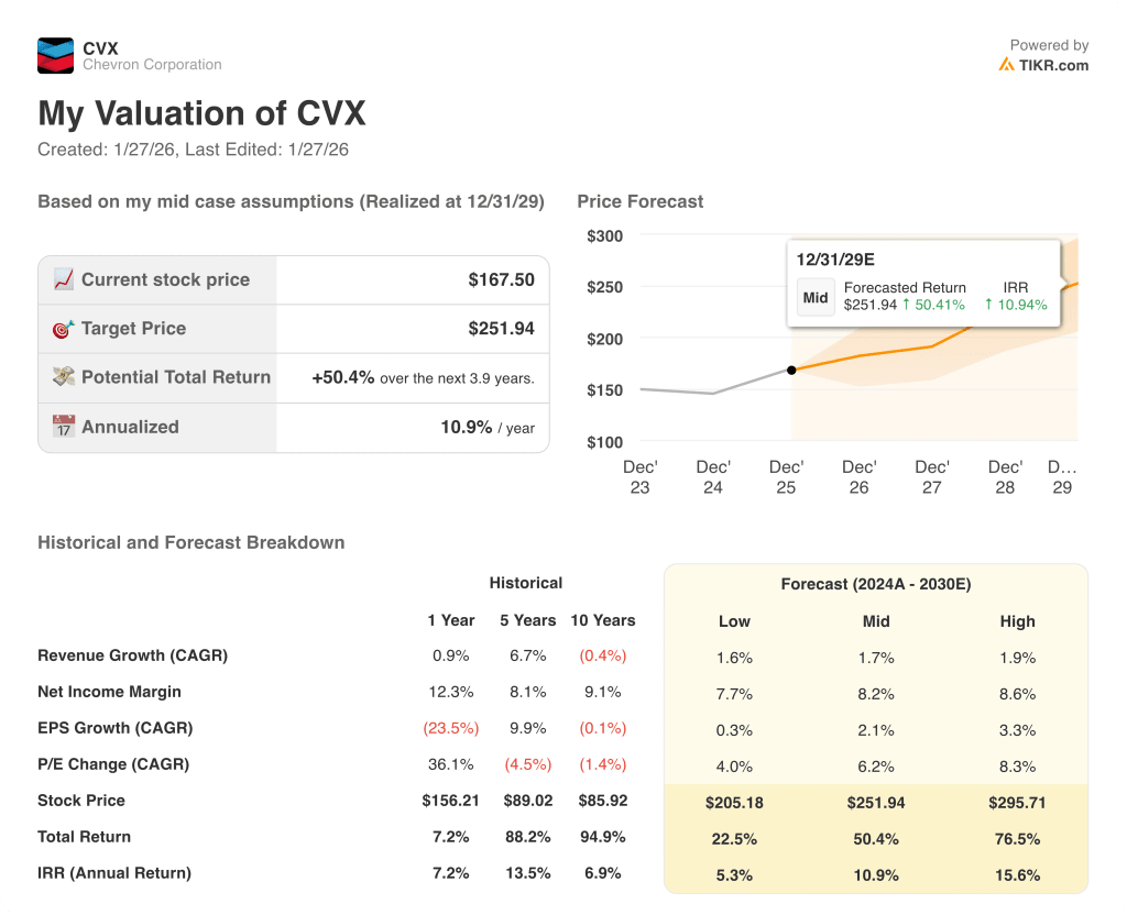 深入りする前に、TIKRのバリュエーション・モデル(無料)を使って、シェブロンの現在の株価がすでに正常化した原油価格と資本規律を反映しているかどうかをチェックする。