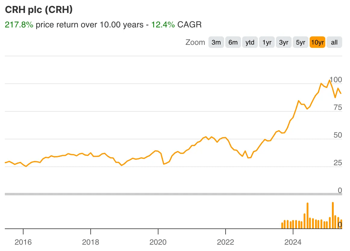 CRH株は過去10年間で217.8%のリターンを記録し、年平均成長率12.4%を示すなど、長期的に高いパフォーマンスを示している。