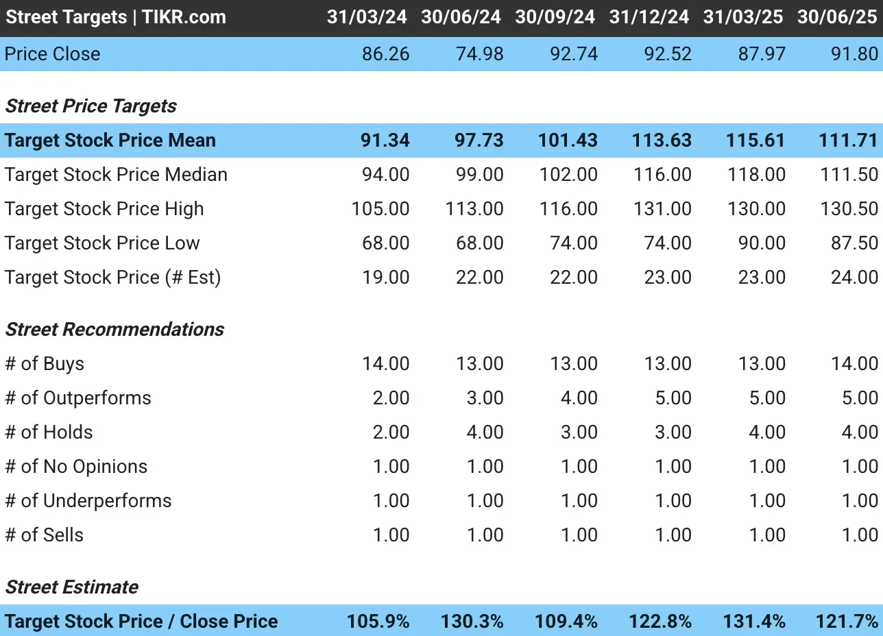 アナリストの予想レンジは87.50ドルから130.50ドルで、インフラ支出のタイミングと実行に関するさまざまな見方を反映している。