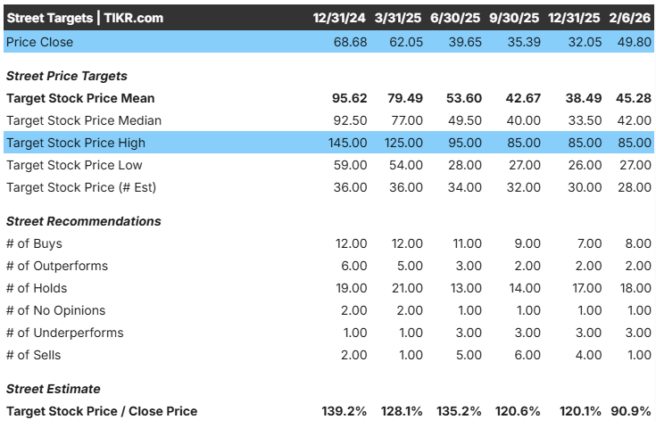 コンセンサス・ターゲットは低いが、TIKRのストリート・ハイ・ターゲットは、回復が定着すれば、株価はここから2倍近くになる可能性を示唆している。