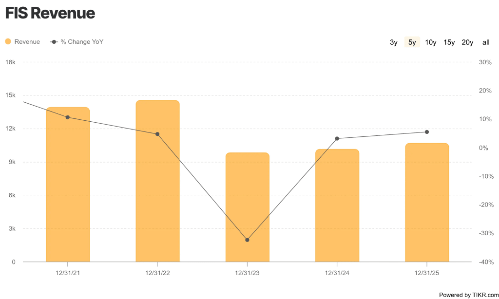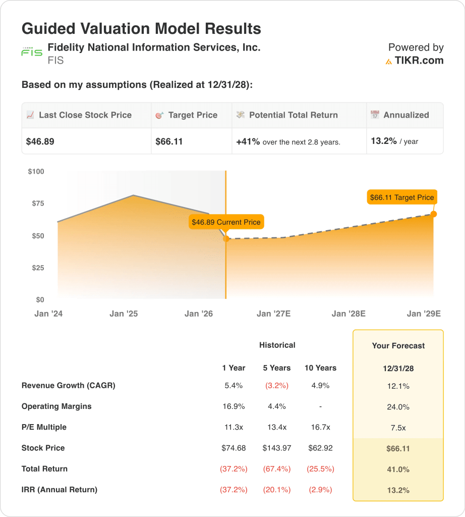 これらの前提は、意味のある回復を意味するが、積極的な倍率ではない。FISの2025年の売上高は107億ドルで、LTM EBITマージンは22.0%である。12.1%はFISが2025年に記録した5.4%の収益成長率を大きく上回るため、より厳しい前提は収益成長率である。