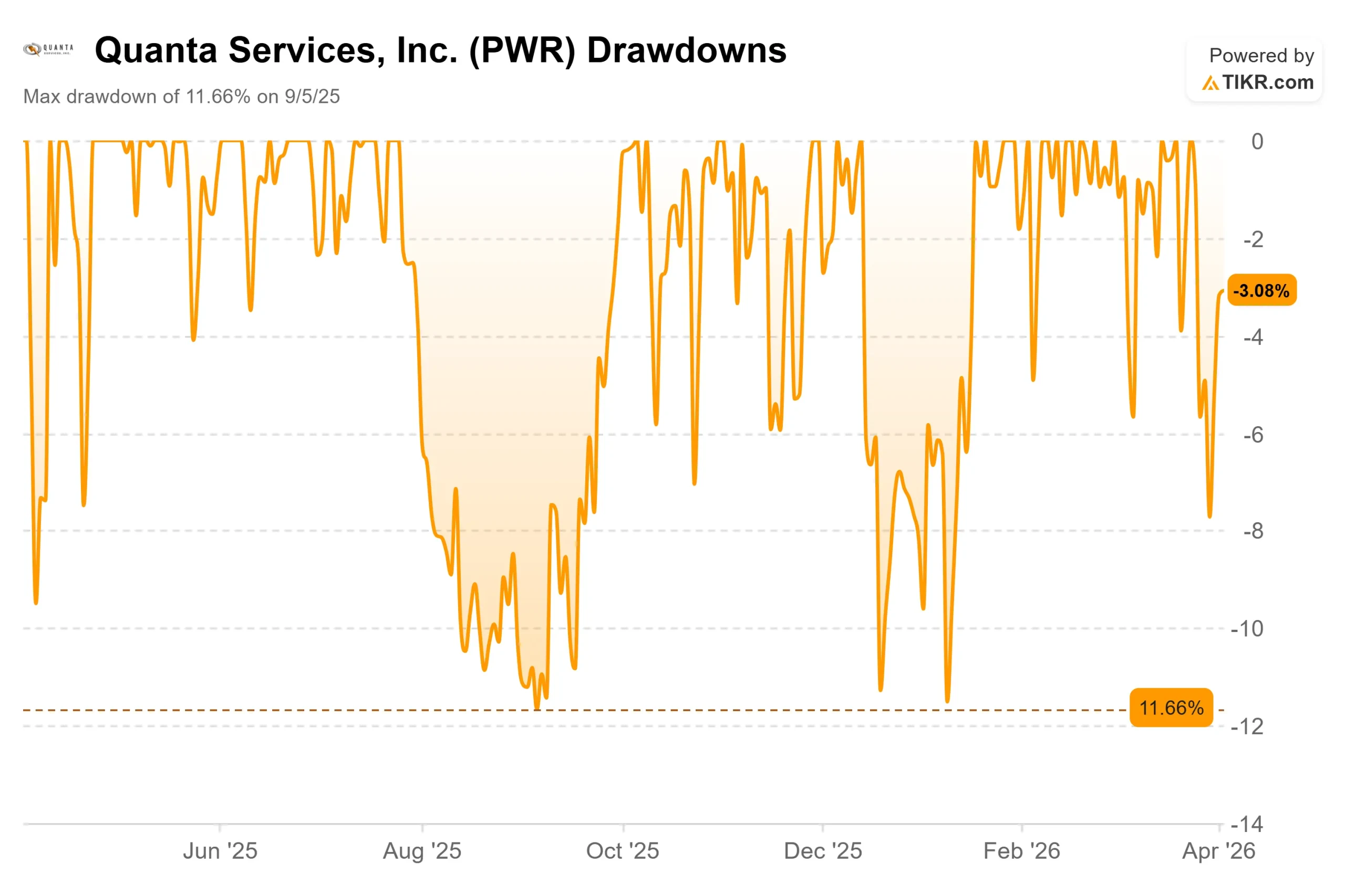 クアンタ・サービシズ (PWR)の株価は、過去1年間でおよそ245ドルから560.63ドルまで2倍以上に上昇し、2026年3月18日には史上最高値の583.73ドルを記録した。