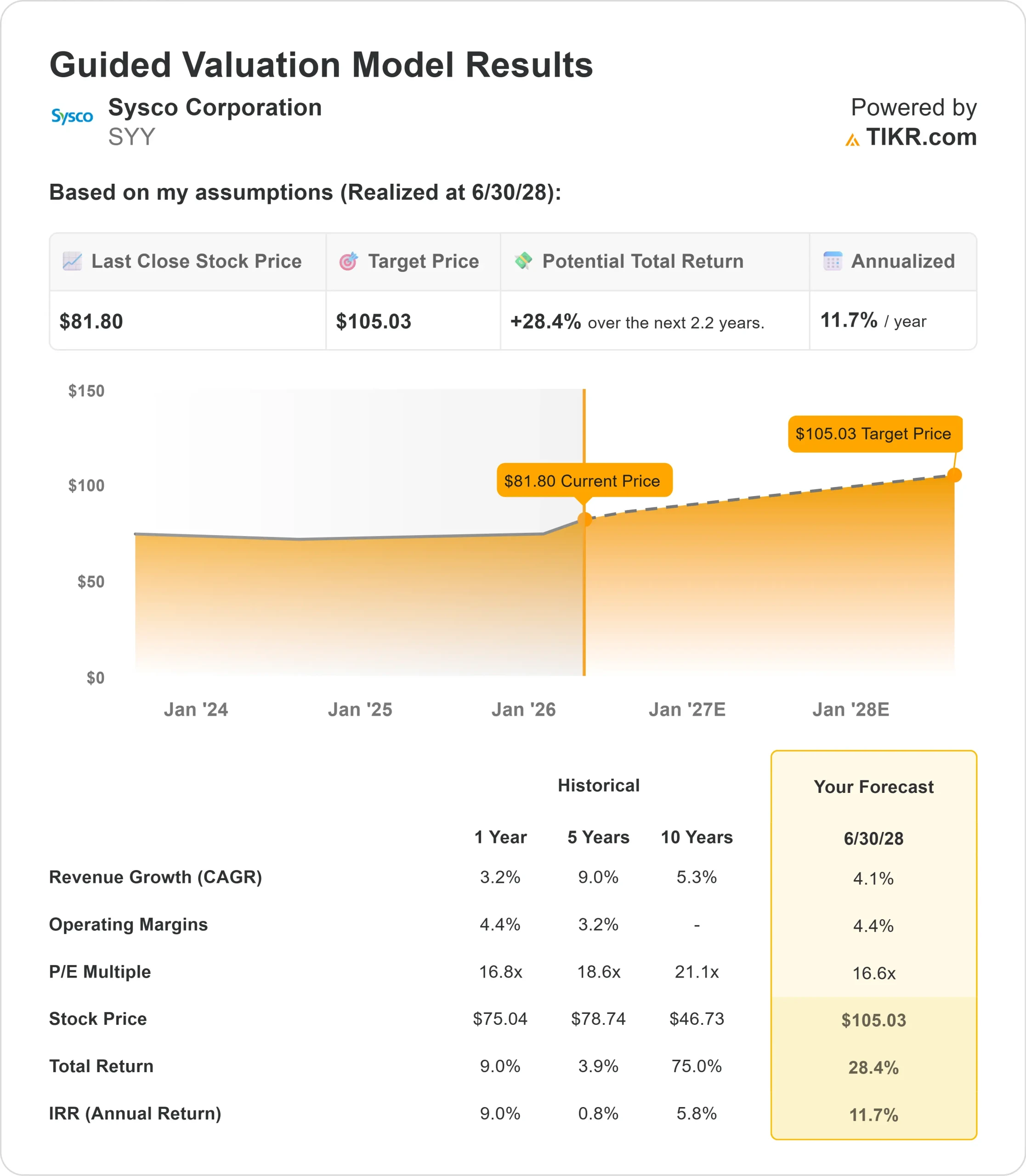 そこから、TIKRはブル、ベース、ベア シナリオの下での潜在的な株価とトータルリターンを計算しますので、銘柄が割安か割高かを素早く確認することができます。