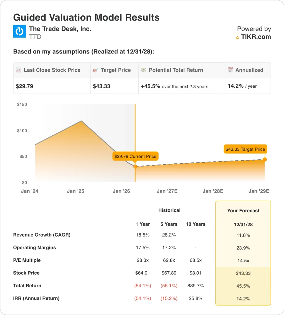 現在のバリュエーションでは、トレードデスクはフォワードEBITDAで約10倍、フォワード利益で約14.5倍で取引されており、これは過去のアドテクノロジーのバリュエーションよりも大幅に低い。誘導バリュエーションは、短期的な成長期待の大半が現在の株価に既に反映されていることを示唆しており、平均目標株価が今日の取引水準に近い理由を説明する一助となっている。