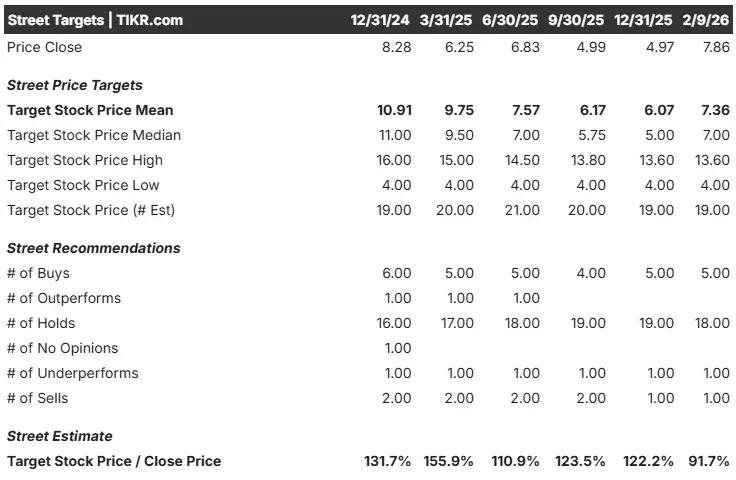 株価は~7.20ドルで取引されており、市場はゼロ成長を織り込んでいる。7.36ドルのターゲットは、アナリストが再格付けのための触媒がすぐにないと見ていることを意味する。