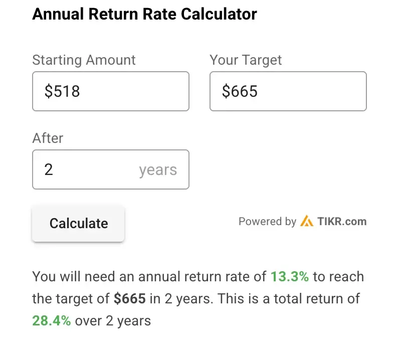 現在の価格水準518ドルからすると、今後2年間のトータル・リターンは約28%、年率13%となる。これは株式市場の長期平均年間リターン10%を上回る。