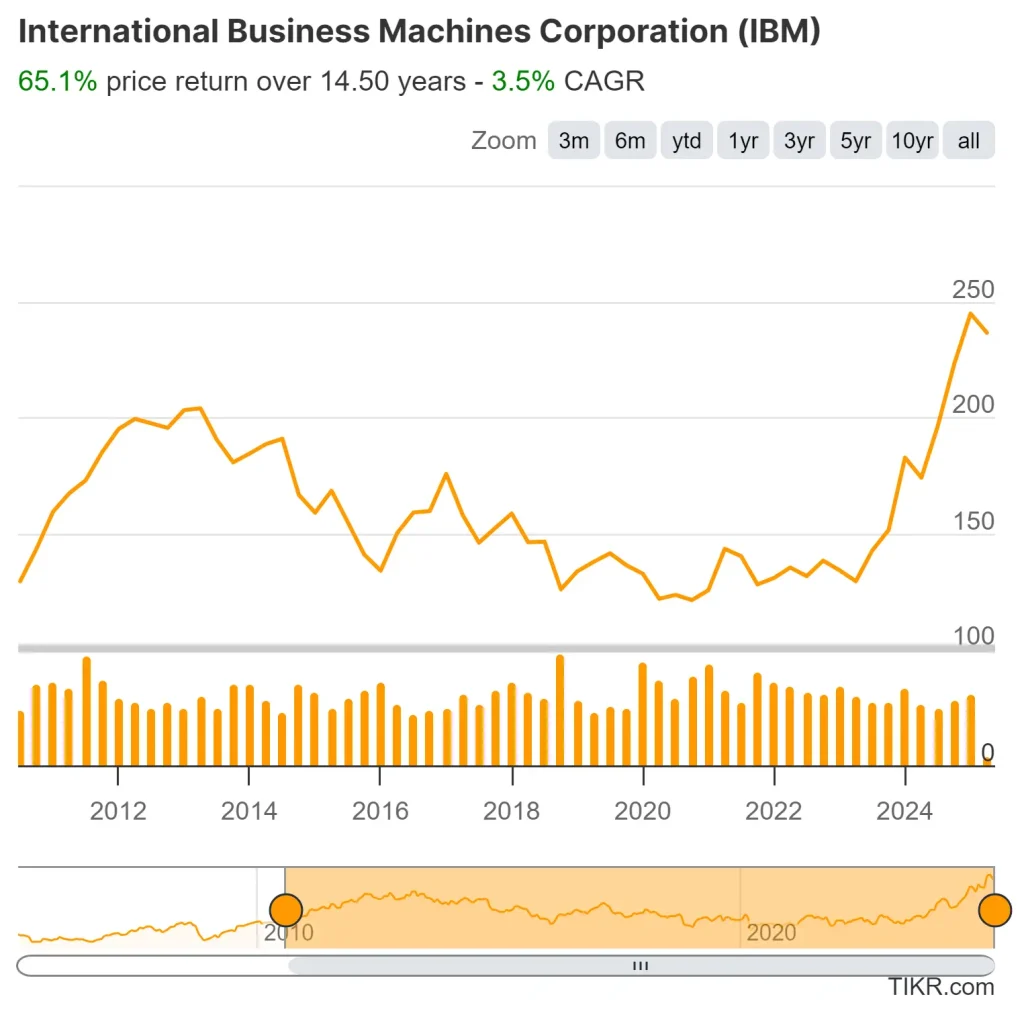 - 여러 차례의 턴어라운드 노력에도 불구하고 IBM의 주가는 보합세를 유지한 반면, Microsoft(MSFT)와 같은 경쟁사는 강력한 매출 성장으로 주가가 급등했습니다.