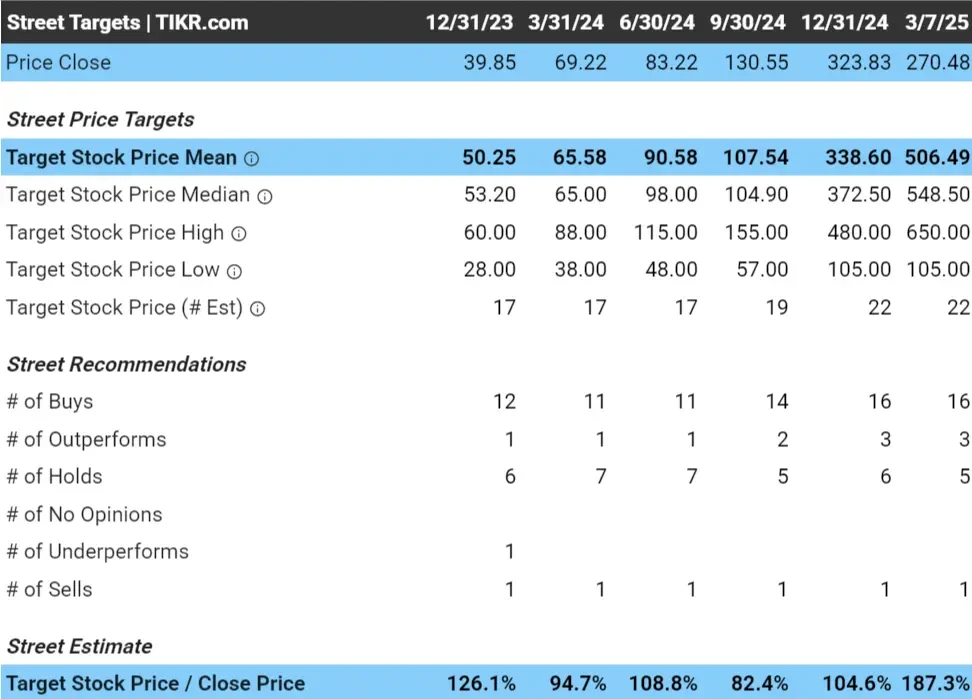 지난 3개월 동안 주가는 30% 이상 하락했지만, 애널리스트들은 여전히 주당 평균 목표 주가가 506달러로 거의 100% 상승할 것으로 보고 있습니다.
