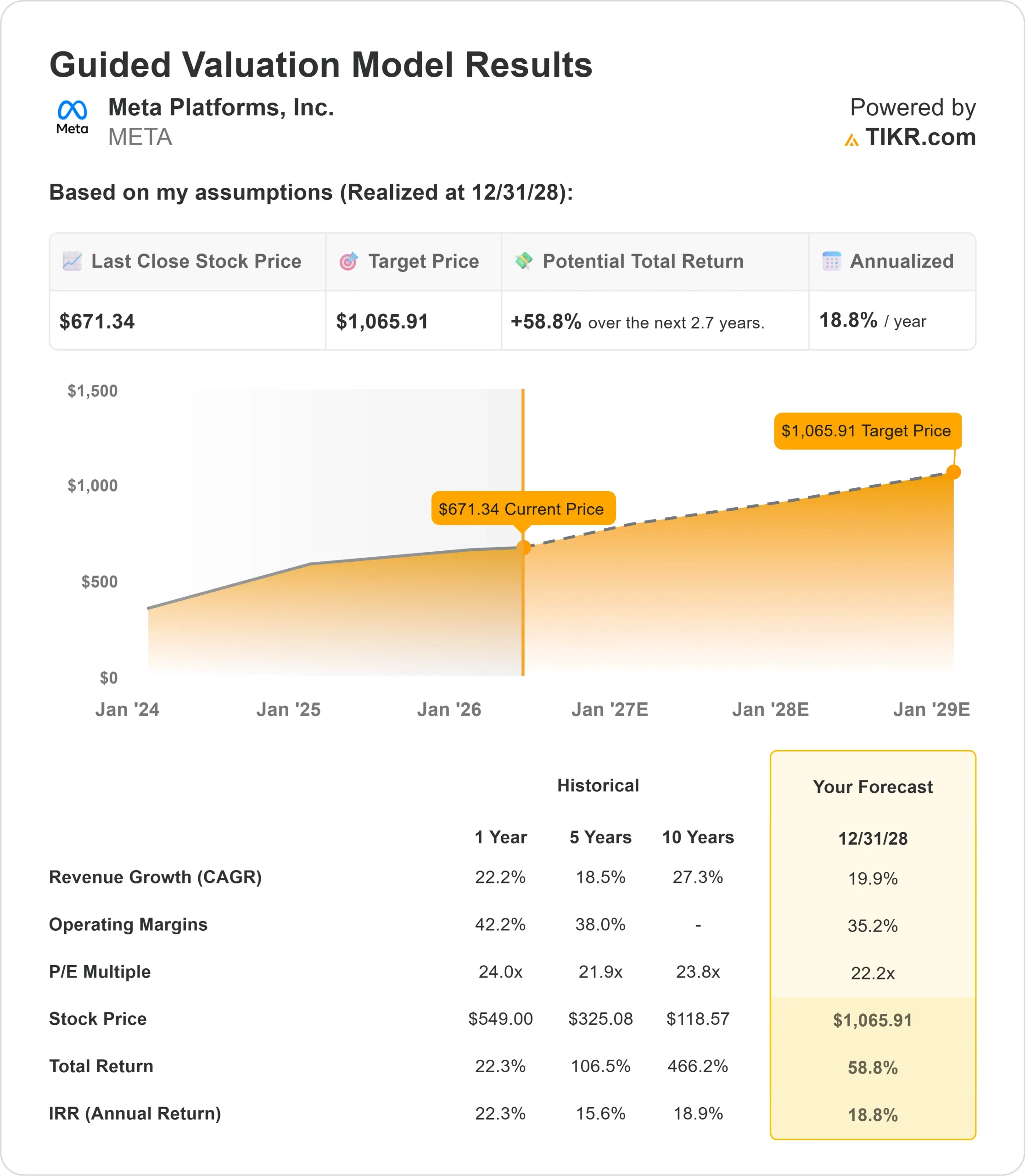 그런 다음 TIKR은 상승 , 기본, 하락 시나리오에서 잠재적인 주가와 총 수익률을 계산하여 주식이 저평가된 것인지 고평가된 것인지 빠르게 확인할 수 있습니다.