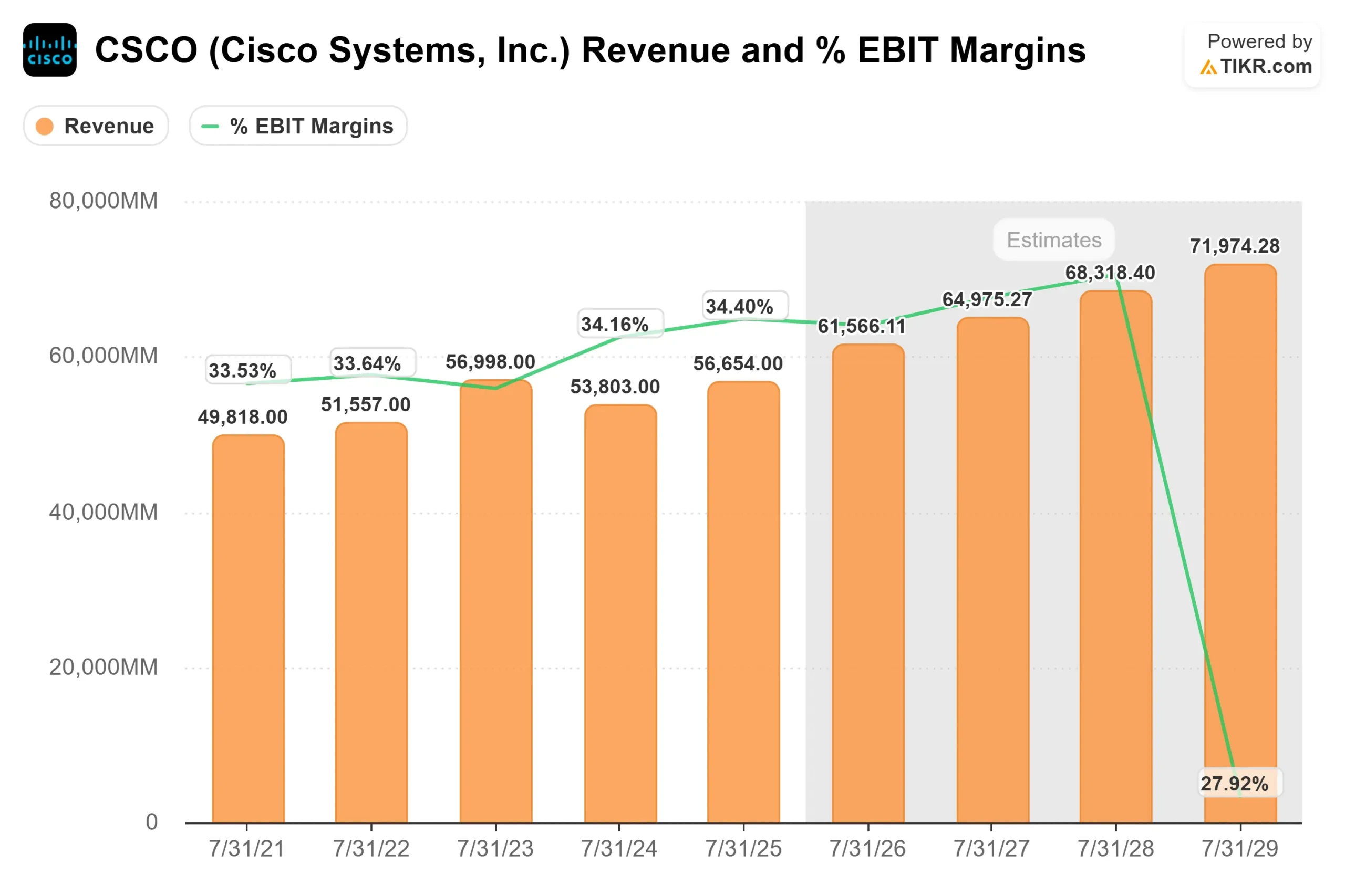 "하드웨어 가속화" 마진 레버. 목표 주가 90달러에 도달하는 기계적 경로는 Cisco가 하드웨어 가속 플레이북을 실행하면서 막대한 매출 규모를 유지할 수 있는 능력에 크게 의존합니다. 이 모델의 중간 사례는 예측 기간 동안 매우 현실적인 2.8%의 매출 연평균 성장률을 가정합니다. 이러한 꾸준한 확장은 하이퍼스케일 AI 인프라 주문의 폭발적인 성장, 지속적인 다년간의 캠퍼스 네트워크 교체, 통합 보안 포트폴리오 내에서 구축되는 유기적인 모멘텀에 의해 주도되고 있습니다.
