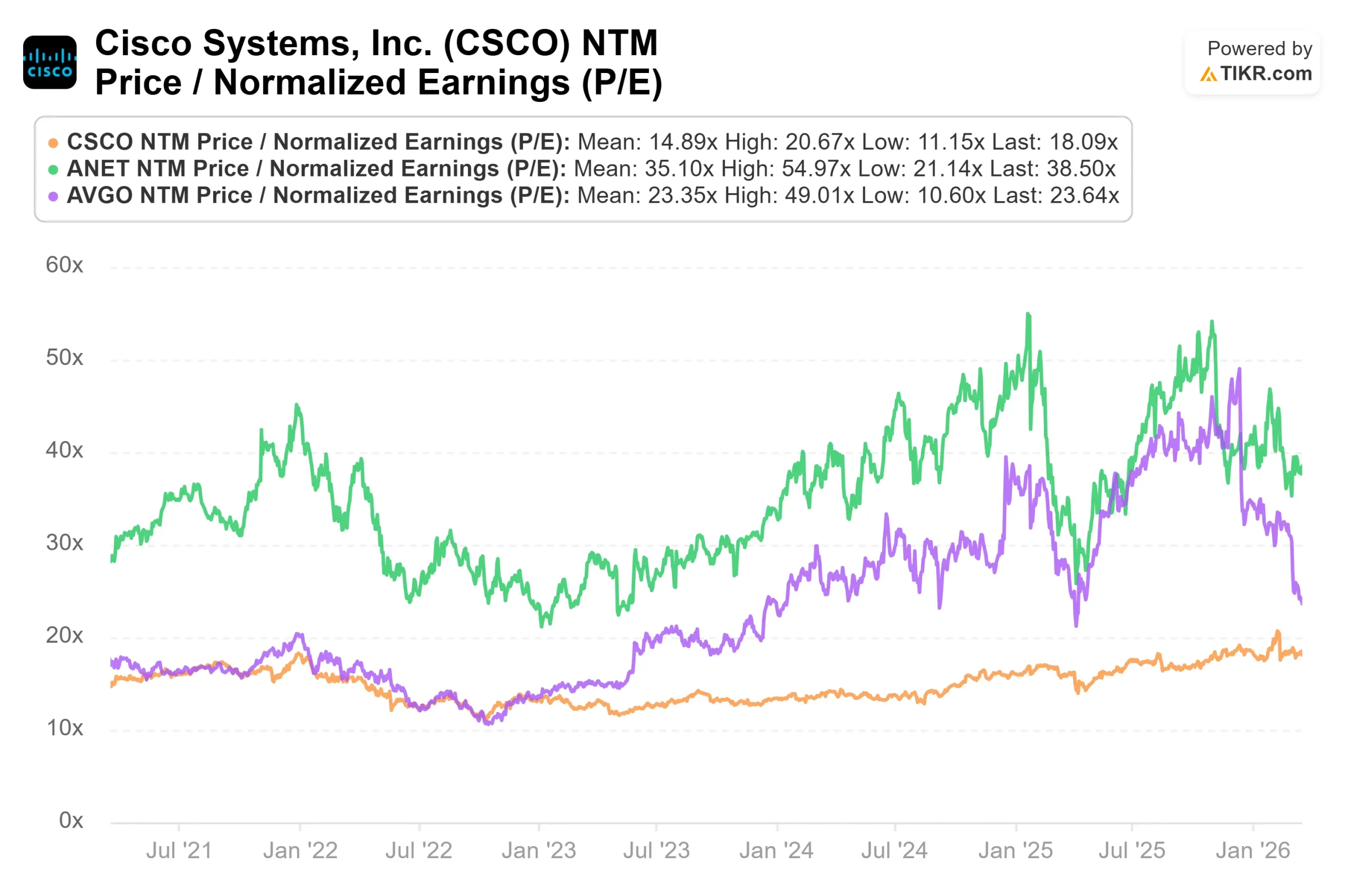 Broadcom(AVGO), Arista Networks(ANET) 같은 AI 네트워킹 및 인프라 동종업체와 비교했을 때 Cisco의 기업 가치는 매우 매력적으로 보입니다.