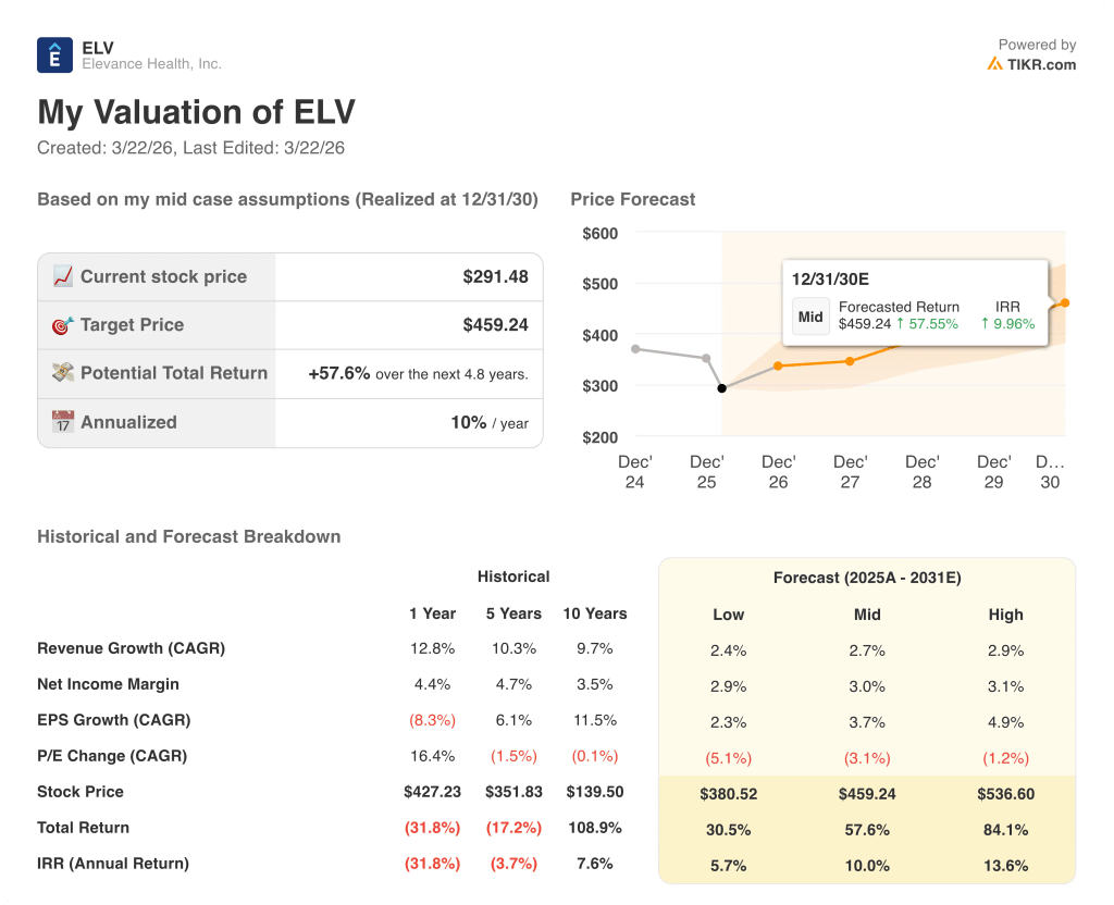 ELV 주식을 불러오면 수년간의 과거 재무 정보, 월스트리트 애널리스트가 예상하는 다음 분기 매출과 수익, 밸류에이션 배수가 시간에 따라 어떻게 변했는지, 목표가가 상승 또는 하락 추세인지 등을 확인할 수 있습니다.