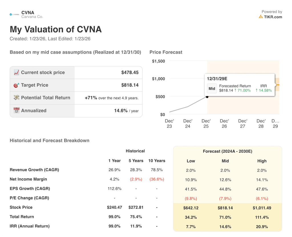 TIKR에서 무료로 사용자 지정 모델을 실행하여 Carvana의 현재 주가가 실행 주도 이익의 여지가 있는지 평가하세요.