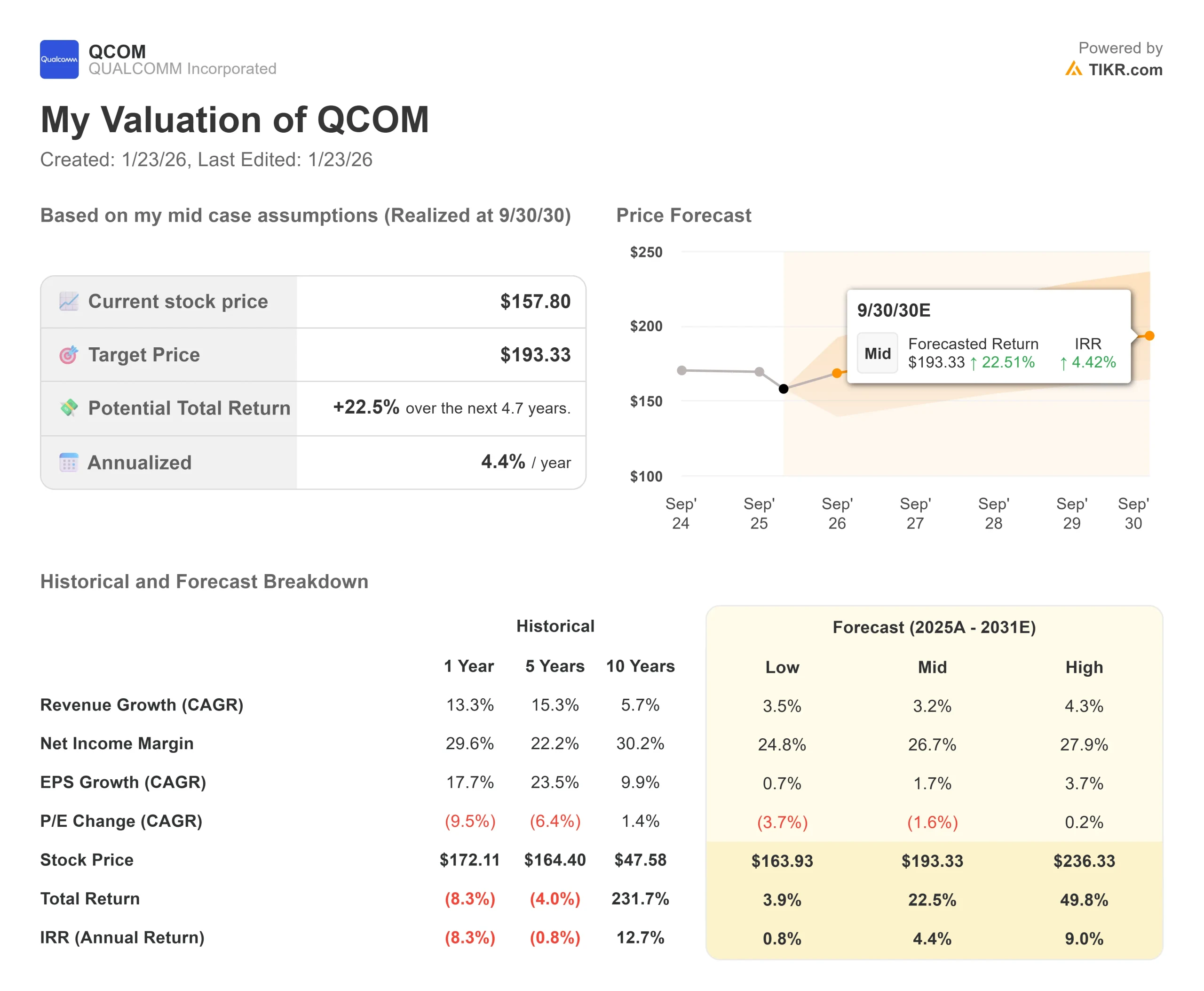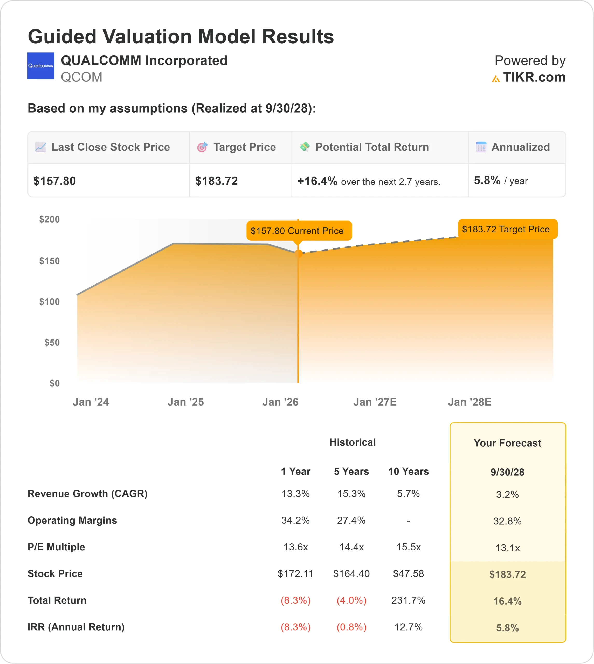 기본적으로 이 모델은 퀄컴의 가치가 상당히 높다는 것을 시사합니다. 사업 다각화 노력은 사실이지만, 현재로서는 폭발적인 상승세를 이끌기보다는 대규모 모바일 비즈니스의 느린 성장을 상쇄하고 있을 뿐입니다.