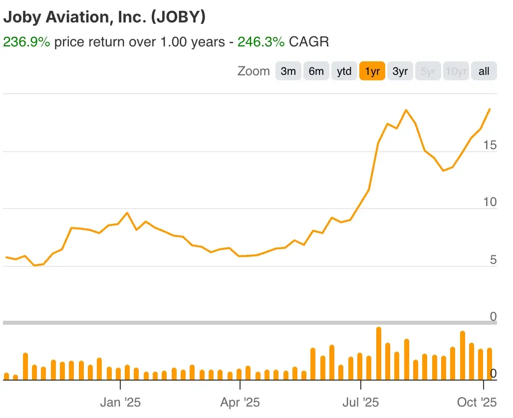 JOBY 주가는 8% 하락했지만, 지난 12개월 동안 3배 이상 상승했습니다.